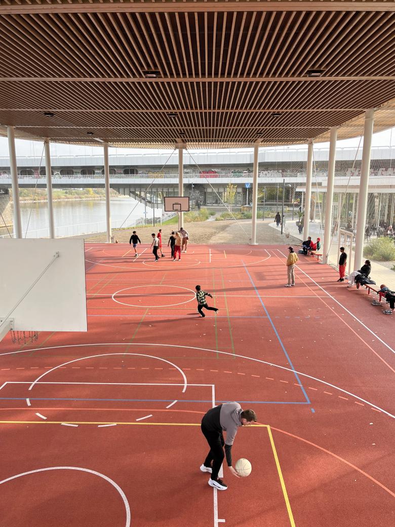 Directly adjacent, the Multifunctional Sports Field continues the colour and material of the Future Fitness zone. A waterproof roof shields from the rain and extends the season into colder months. A transparent net encloses the playing field without obstructing views of the Danube or the Viennese skyline. Colour-coordinated waiting benches define the field edges.