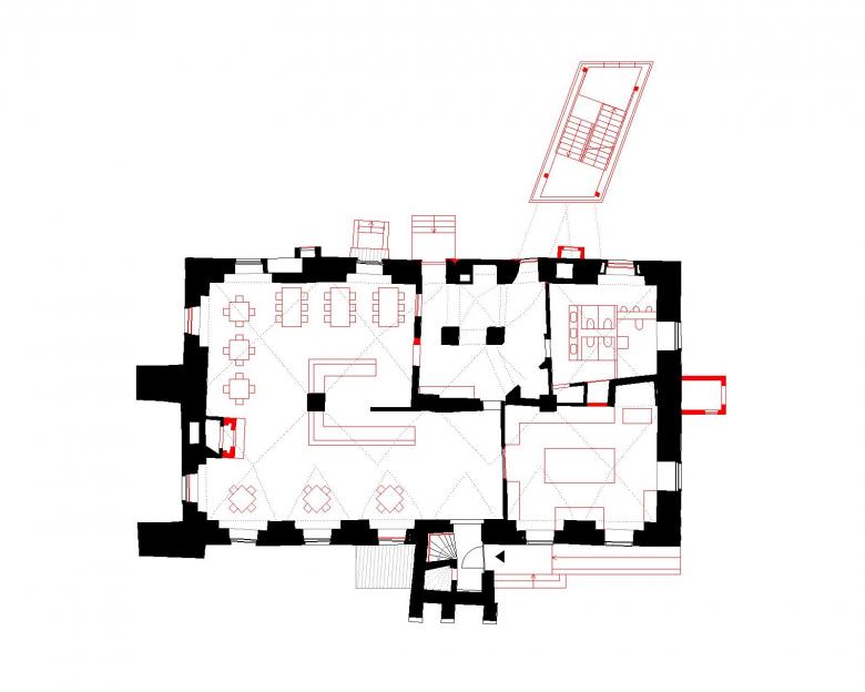 The most obvious intervention is the construction of an external stair tower. It rises prominently behind the building as if to form a stabilising anchor for the historic castle tower, which leans forward. The steel construction, clad in carbonised wood, is a visibly contemporary element adjoining the castle. With its rough, sooty surface, the tower represents a counterpart to the bright white plaster façade.