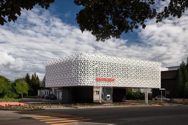 Airily veiled – The bank branch is situated in the village centre among its heterogeneous structures. Its very striking otherness inserts it intelligently into the surroundings. Placed upon two supports – the drive-in ATM and the access core – the building towers over the forecourt. The mirrored bearings and the extreme projection of the upper level make the volume seem weightless.