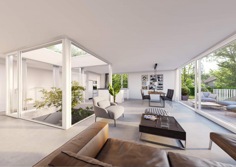 Die Grundrisse sind je um diesen zentralen Aussenraum organisiert. Der grosszügige Wohn-Essbereich im Erdgeschoss wird in unterschiedlich bewohn- und möblierbare Zonen unterteilt. Die Schlafzimmer mit Fenster an der Aussenfassade und oder zum Lichthof sind je nach Einheit im Geschoss darunter oder darüber über eine innenliegende Treppe erreichbar.
