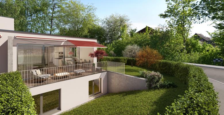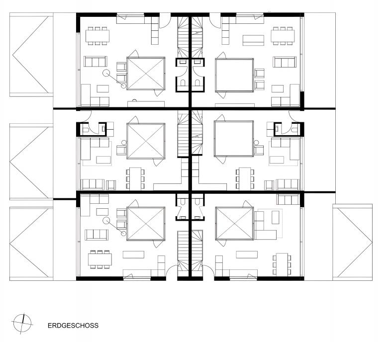 Das Design basiert auf der Idee, eine harmonische Wohnumgebung zu schaffen, die sowohl Gemeinschaft als auch viel Privatsphäre bietet. Jede der 4.5-Zimmer Einheiten verfügt über einen ganz privaten Aussenraum im Herzen des Hauses, der den Bewohnern eine ruhige Zuflucht gibt. Wohnen und Schlafen, auf unterschiedlichen Stockwerken - werden zusammengebracht, das Haus wird durch die fließende visuelle Verbindung vom oberen zum unteren Stockwerk zusammengebracht und gleichzeitig erweitert.