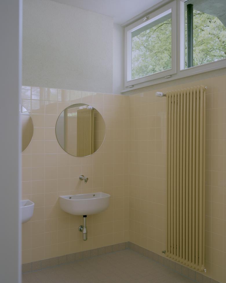 Die Sichtbetonfassade befand sich vor der Sanierung in sehr schlechtem Zustand, die über die Jahre korrodierte Bewehrung wurde unsachgemäss repariert und Fassadenflächen mehrfach verputzt und überstrichen. Statt einer CO2-intensiven Rekonstruktion wurde gemeinsam mit der Denkmalpflege ein detailliertes «Flickkonzept» entwickelt. Nach Abtragung der Deckschichten und Sanierung der Bewehrung wurde der Beton tiefenhydrophobiert und mittels Retusche in die Farbigkeit und grafische Struktur der historischen Oberflächen mit Bretterschalung rückgeführt.