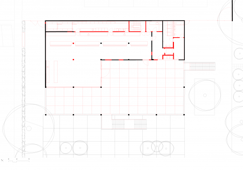 Das Tragwerk des Baus war entsprechend den Maximen der 60er Jahre funktional und minimalistisch dimensioniert. Die neuen Nutzungen wurden entsprechend dem räumlichen Angebot integriert. Das Obergeschoss, in dem sich zuvor eine grosse Produktionsküche mit einem kioskartigen Fenster zur Bedienung befand, wurde in einen für alle Gäste zugänglichen Selbstbedienungsbereich umgebaut, der sich zur teilweise gedeckten Terrasse mit Blick über die Aussenanlage des Bades hin öffnet. Die neue Gastroküche mit Nebenräumen erstreckt sich entlang der strassenseitigen Nordwestfassade. Wo bauliche Massnahmen notwendig waren, wurden sie möglichst im Sinne der Erbauer umgesetzt. So lassen sich etwa die neuen Betonunterzüge dank einer sorgfältig geplanten Schalung kaum von den bestehenden unterscheiden.