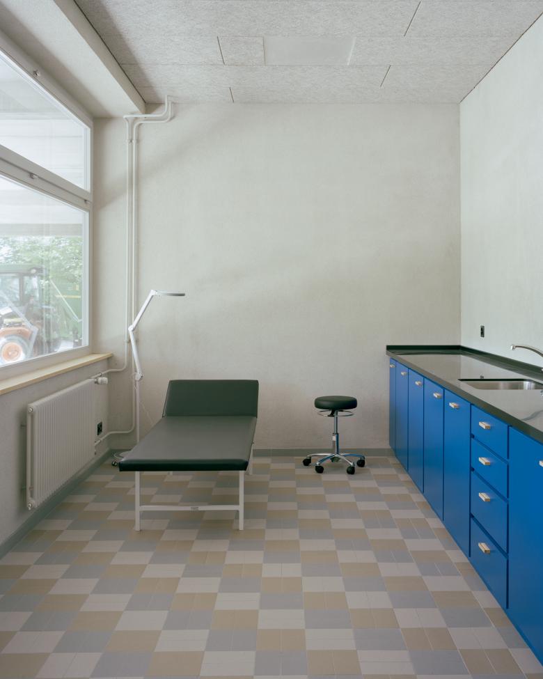 Im Innenausbau präsentierte sich das ursprünglich nicht der Öffentlichkeit zugängliche Betriebsgebäude zweckmässig und monochromatisch. Für den Einzug des Restaurants mit bis zu 7’000 Gästen an Wochenenden wurden die inneren Oberflächen komplett überarbeitet. Ein bauzeitliches Verlegemuster im Vorraum diente als Inspiration für den farblich an eine heitere Badstimmung angelehnten Plattenboden. Wände, Einbaumöbel und Platten in selbstbewusstem Königsblau schaffen eine kohärente räumliche Zusammengehörigkeit in den öffentlich zugänglichen Räumen, während die Betriebsräume entsprechend der historischen Logik in zurückhaltenden Farben gestaltet sind.