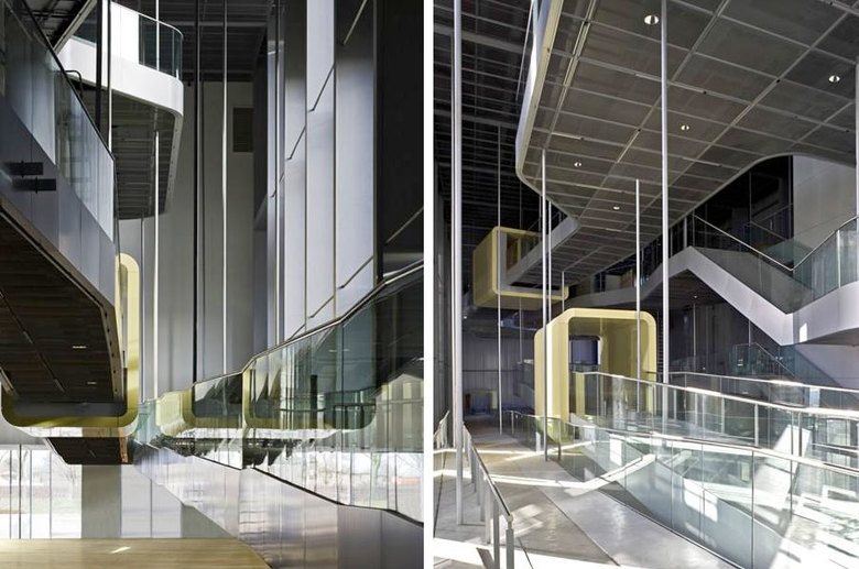 In concept, GATERMANN + SCHOSSIG’s new building seeks to convey the proportions and scale of an ancient Roman basilica that previously occupied the site through a distinctively contemporary use of form and materials. Within, the sheer scale of the enclosure is enhanced by a series of dynamic platforms and ramps bearing exhibitions spaces and access routes that are suspended from the ceiling, appearing to freely float in space. The building’s structural steel columns are conceived as oversized box frames which create an imposing sense of enclosure immediately upon entering the building; however, as visitors move through the space a series of glazed elements – suspended glass panels designed by the artist Thomas Weil – are revealed, introducing a welcome sense of transparency and flooding the interior with natural light. The exhibits are organised as a timeline which allows visitors to explore Roman life in Xanten by starting on the ground floor and chronologically winding its way upwards and through the building.
