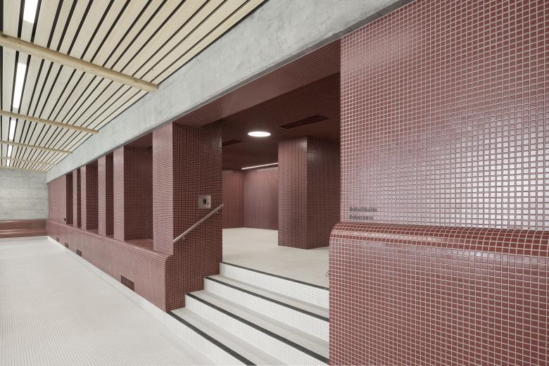 Abgerundet wird das Zusammenspiel von Alt und Neu durch ein gesamtheitliches Materialkonzept, welches in der Weiterverwendung der primären Werkstoffe Beton, Holz und Keramik der ursprünglichen Anlage mit den neuen Materialien des Erweiterungsbaus stimmig umgesetzt wurde.