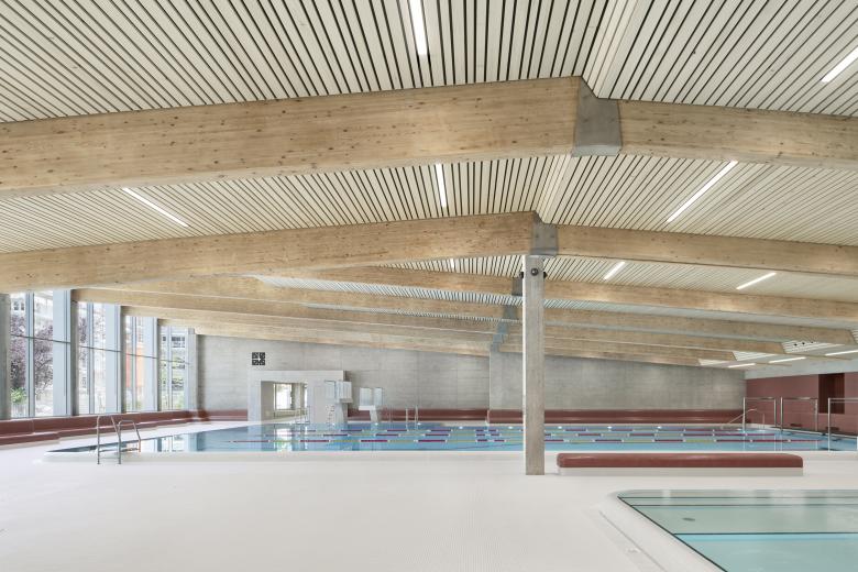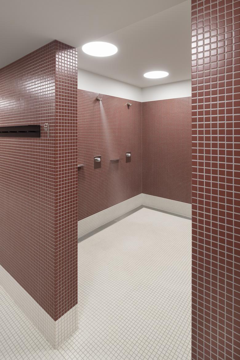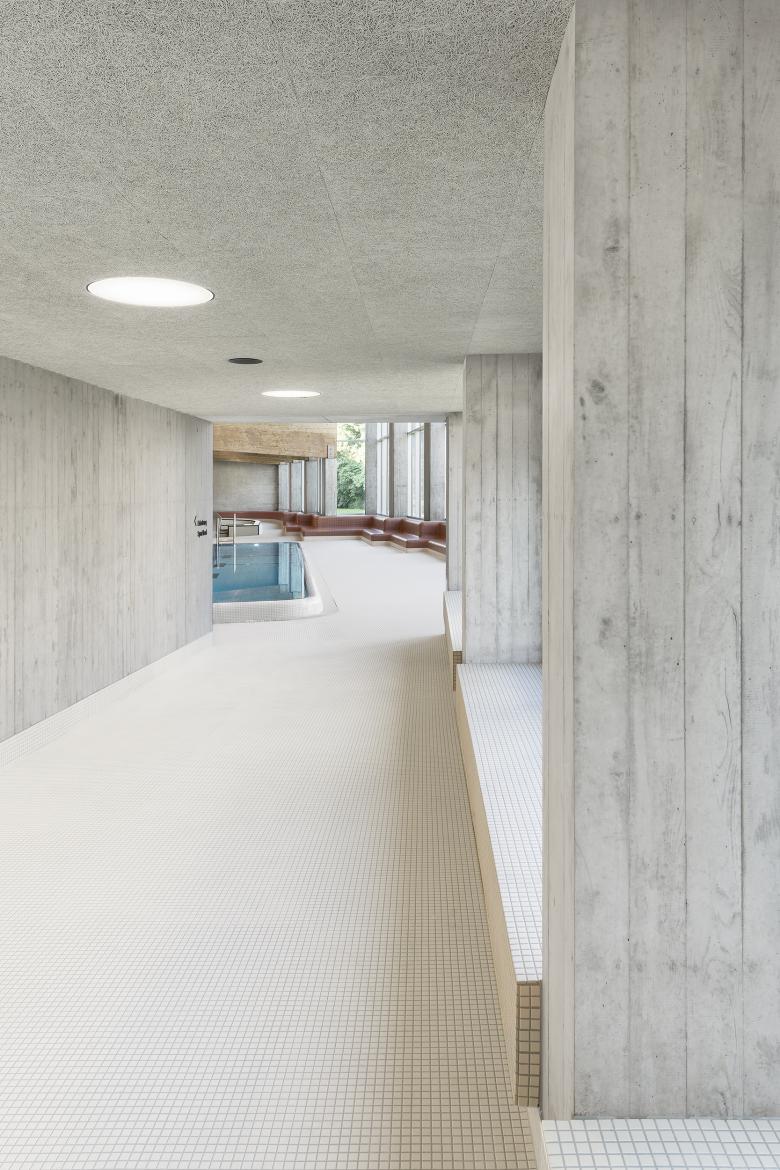 Der Fokus der rücksichtsvollen und gesamtheitlich gedachten Sanierung im Innenraum lag auf der Erhaltung der vorhandenen architektonischen Qualitäten durch kaum wahrnehmbaren Ergänzungen. Die Gestaltungsmerkmale des Bestands, wie die ansteigende Holzdecke, die grossflächige Verglasung, die zeittypischen Beckenränder und Sitzbänke entlang der Aussenwände sowie auch die unterschiedlichen Niveaus der Anlagen wurden während der Sanierung herausgestellt und harmonieren mit den neuen Eingriffen.