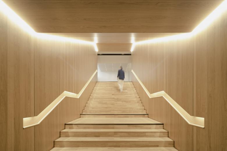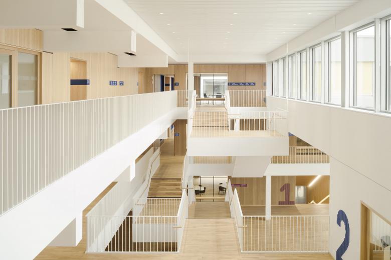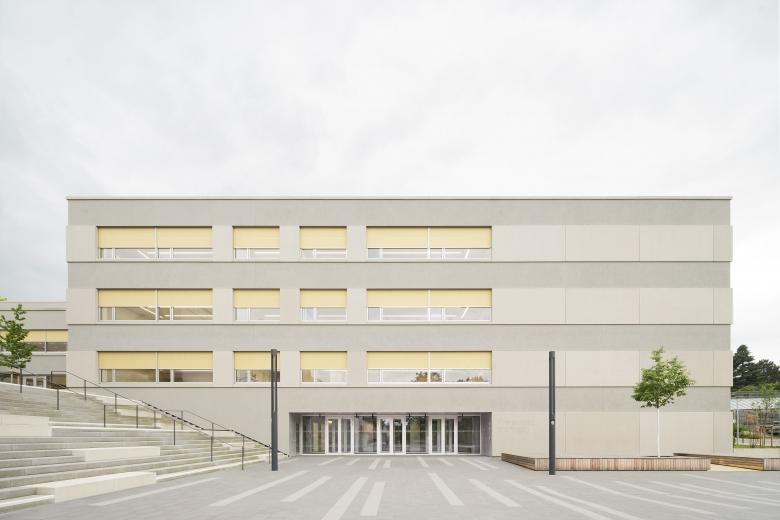 Da das Gebäude in den Hang hinein gebaut wurde, entstehen attraktive Freiflächen mit Bezug zu den unterschiedlichen Gebäudeebenen. Ringförmig legen sich die Neubauteile mit den neuen Fachklassentrakten um den Bestandsbau, der zum »Lernhaus« wird und mit den »Cluster-Flächen« ein wesentliches Element des pädagogischen Konzepts beherbergt: Flexibel nutzbare Flächen, die sich auch für Still- oder Gruppenarbeiten sowie als Aufenthaltszonen anbieten. Um jeden »Cluster« gruppieren sich pro Geschoss jeweils sechs Klassenzimmer. Die von großen Fensteröffnungen geprägte Fassade wird durch den Wechsel von glatten Betonfertigteilen und rauem Putz horizontal gegliedert, ihren besonderen Reiz erhält sie durch das subtile Relief der Oberflächen. Die dreigeschossige, lichtdurchflutete Aula verbindet die Lernhäuser über Galerien mit dem Fachklassentrakt, so dass zwischen den Ebenen attraktive Blickbeziehungen entstehen. Dank der Hanglage bietet die Aula auf zwei der drei Geschosse Verbindungen in die umgebenden Außenanlagen.
