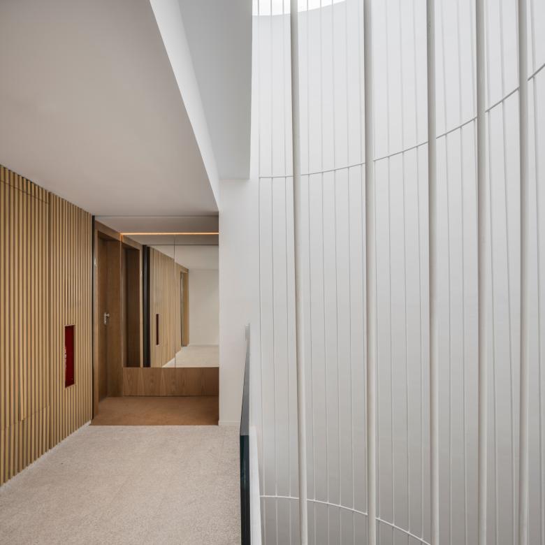 In the interior, the floorplan is organized around a curved staircase, creating a central core from which the apartments are distributed along in two orientations. This vertical circulation space is closed off by a lightweight structure that allows zenithal light to filter through to the lower levels, giving this space a unique character.