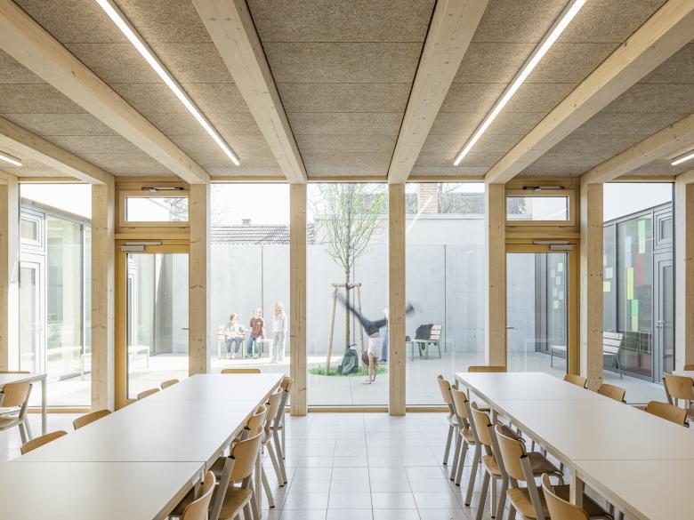 Um ein ganzheitlich nachhaltiges Projekt umzusetzen, stand nicht nur der Aspekt, so viel wie möglich zu erhalten, im Vordergrund, sondern auch der überwiegende Einsatz regenerativer Materialien. Deshalb wurden die beiden Zubauten Ost und Nord mit einer Nutzfläche von rund 1.420 m² und der Turnsaal mit einer Nutzfläche von rund 380 m² in vorgefertigter Holzbauweise geplant, mit dem Ziel die Vorteile des Materials als nachwachsenden und nachhaltigen Rohstoff effizient einzusetzen. Weitere Vorteile dieser Bauweise waren eine kurz Bauzeit sowie reduzierte Emissionen auf den laufenden Schulbetrieb und die Anrainer.