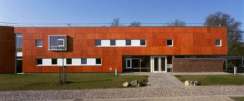 Die Anlage des Pflegeheimes bildet ein spannungsvolles Ensemble aus Alt- und Neubau. Die Sichtachsen des denkmalgeschützten Herrenhauses werden freigehalten, der Neubau ordnet sich dem haupthaus unter und wird so Teil der Parklandschaft am See. Die funktionale Qualität der Anlage wird durch die klare Trennung von Pflegebetrieb im Neubau und den gemeinschaftlichen Nutzungen im Altbau gebildet. Der zweigeschossige Neubau wird in Verbindung mit der Fassadengestaltung aus rot lasierten Birkenholztafeln und Torfbrandklinkern zu einem zurückhaltenden Erscheinungsbild. Durch die Aufweitung des Innenhofes wird eine optimale Durchsonnung der Zimmer erreicht. Es entstehen spannungsvolle Aussen- und Innenräume. Die Zimmer erhalten raumhohe, französische Holzfenster, die allen Bewohnern den direkten Blick auf Park und See ermöglichen. Am Kopf der Gebäudeflügel liegen auf jeder Etage großzügig verglaste Aufenthaltsräume mit Kochgelegenheit und Terrasse. Das dreigeschossige rote Ziegelgebäude, das alte Herrenhaus mit seinem mächtigen Walmdach, bildet den Mittelpunkt des Ensembles und ist über einen filigranen Glasgang mit dem Pflegeheim verbunden.