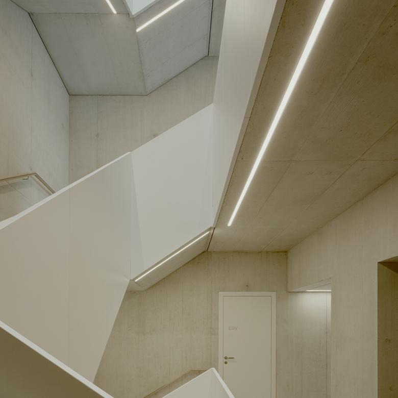 The office building has a high proportion of daylight, which is used for the general lighting of the open office spaces and efficiently combined with artificial light. Customized pendant luminaires are the highlight of the atrium, combined with profile systems for the overall lighting. The lighting concept fits in with the strong design aesthetic defined by the architects and the lighting level of the individual areas adapts dynamically to the needs of the users and the amount of natural light coming in from outside.