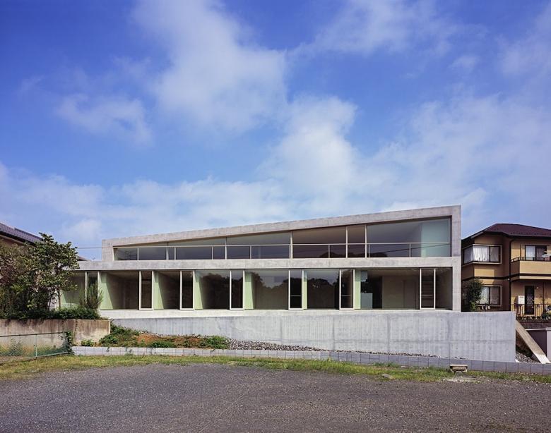 Adopted was single architectural operation. That is, to shift the upper and the lower parts of a three-layered rectangle volume, half buried in slope topography with almost three meters of vertical gap, by its short side. It would form italic “N” shape which provides unchanging woodland scenery in the south and creates a large terrace, while securing privacy and natural light by creating three-dimensional offset against the adjacent land which is currently vacant and used as parking lot or farmland but would be packed with houses in the near future.