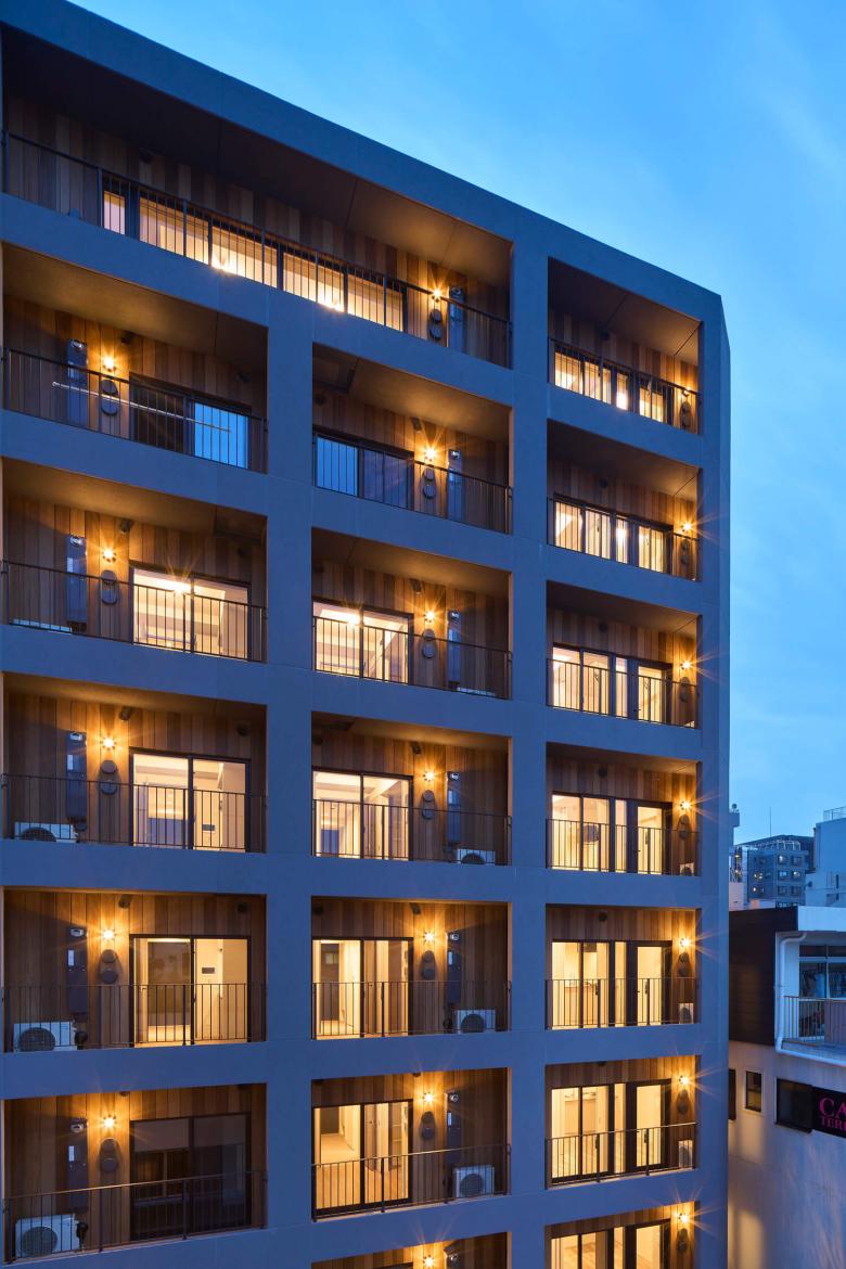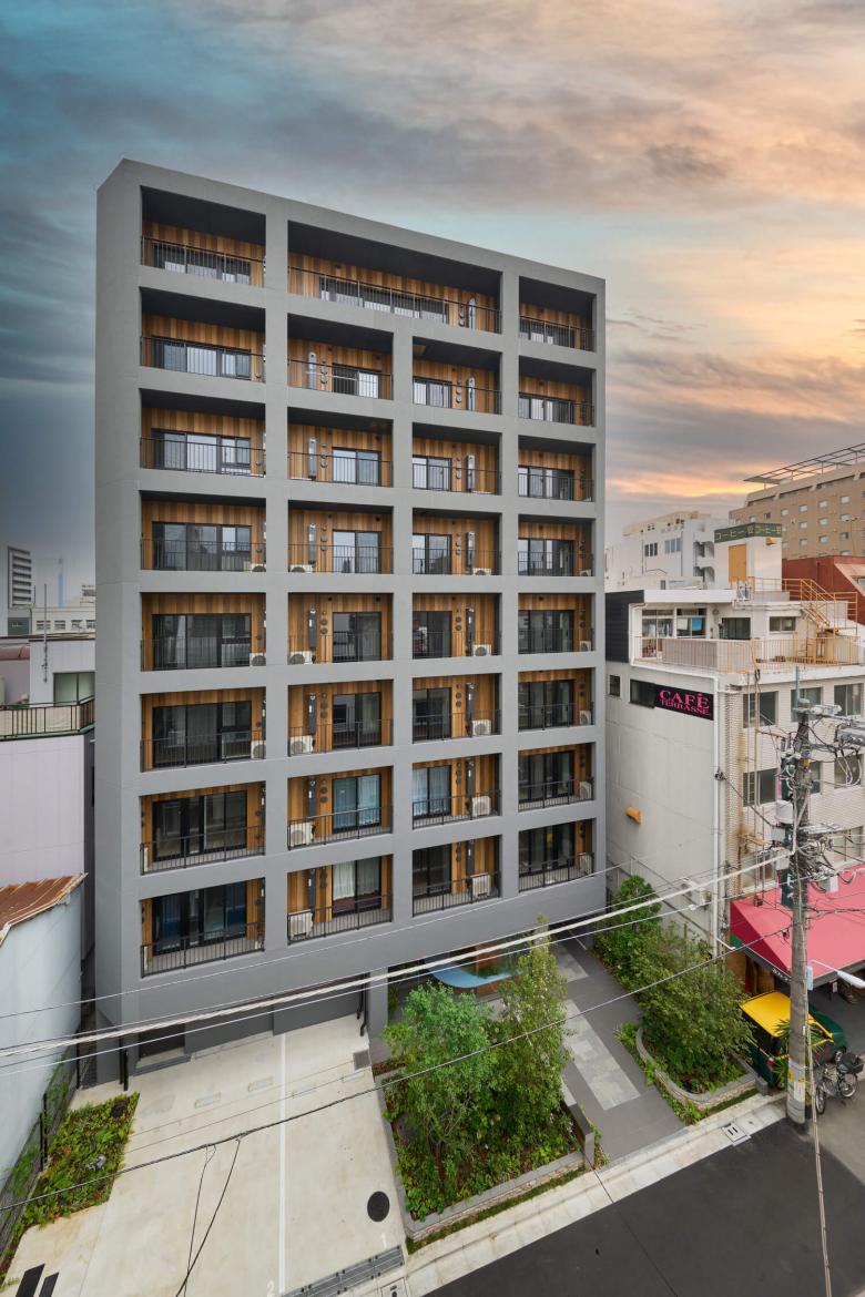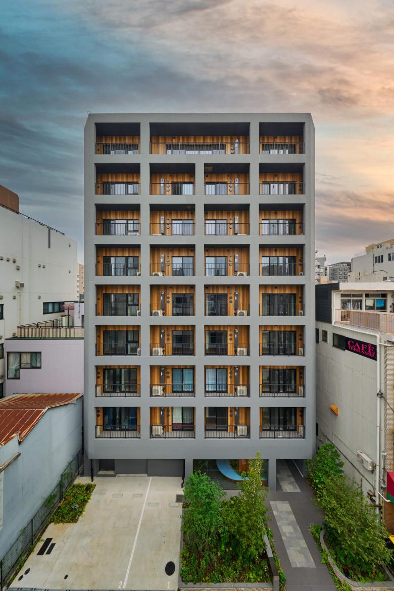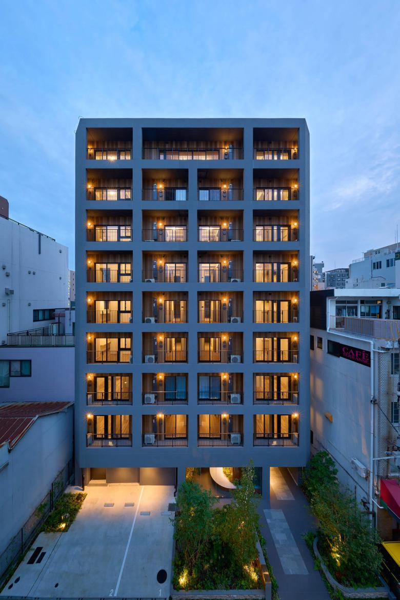 Located just a 3-minute walk from Shin-Okachimachi Station, this 9-storey apartment building comprises 39 units. Surrounding the area are traditional warehouses and small factories that have been in operation since the Edo period, creating a grid-like layout of low-rise buildings that still retain the charm of a traditional downtown neighbourhood. In recent years, the construction of high-rise apartments has been on the rise, leading to a sense of scale and fragmentation of the landscape. This residential complex was conceived as an attempt to redefine the relationship between the city and housing.