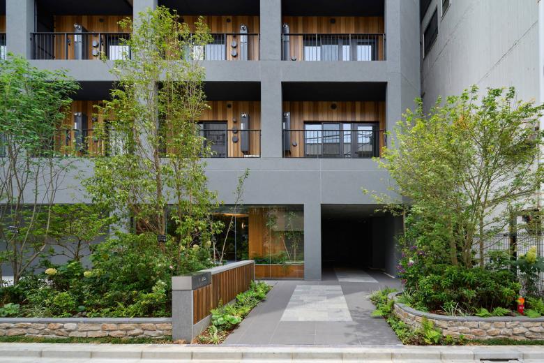 In typical urban apartment buildings, the facades are dominated by balconies, and the exposure of equipment such as air conditioners and water heaters, as well as everyday items, often gives the impression of a cluttered city. In addition, the scale of these buildings tends to correspond to the small size of the individual units, making it difficult to achieve harmony with the surrounding streetscape. Taking these factors into consideration, this plan aims to achieve a calm and orderly urban presence by adjusting the size and placement of openings, exterior colours, and the overall proportions of the building, while avoiding an excessive sense of domesticity and maintaining an open feel. Vertical grilles were adopted for the balcony railings to moderately block views from the outside while allowing wind and light to pass through, thereby maintaining a sense of openness inside.
