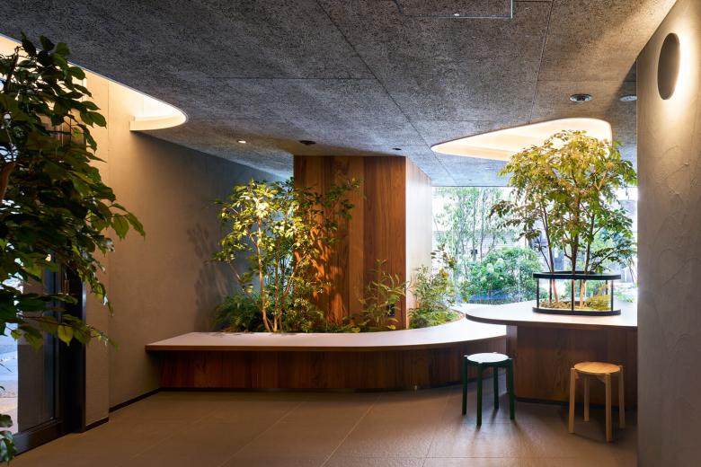 The materials used to support this spatial composition also incorporate thoughtful design elements to impart a gentle expression to the streetscape. The walls of the balconies and common corridors feature wood grain paint. This technique involves applying a light base colour to the concrete surface, then applying a darker colour before it dries, and finally using a wood-grain brush to scrape away the excess, creating a pattern resembling wooden planks. The pattern varies depending on the angle and pressure of the brush, making each one unique. This finish, which feels like handmade work despite being fake, adds warmth and individuality to the uniform urban space, serving as an element that stimulates the senses and memory, and reconnecting people with architecture in the city.