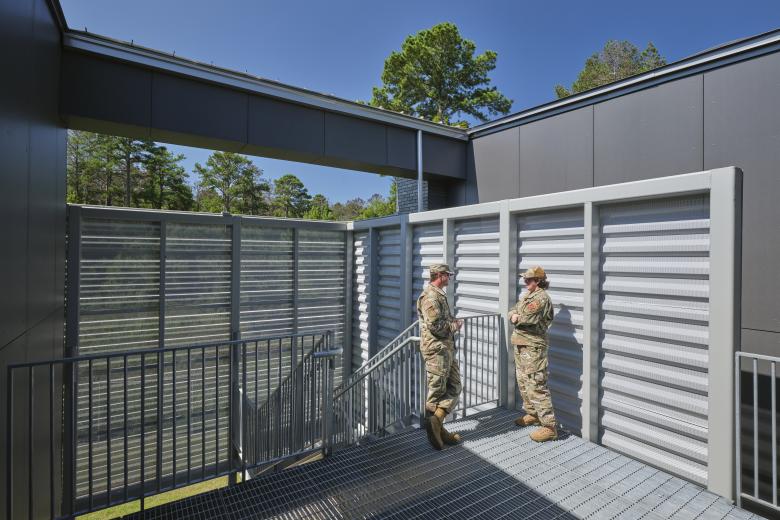The building envelope is designed to minimize interior heat gain and moisture intrusion. The range east and west walls are designed as brick veneer vented rainscreens over insulation which allows constant convection to minimize heat transfer into the tilt up concrete structure and interior. The roof is a floating standing seam metal system over insulation which also limits heat gain. The southern-facing glazing of the classroom is screened by a perforated metal sunshade allowing ample natural light without solar gain. The envelope strategies have proven to be highly effective in maintaining comfortable temperatures in the unconditioned range space and minimizing energy consumption in the conditioned education and support spaces thus avoiding the effects of the southern hot humid climate.