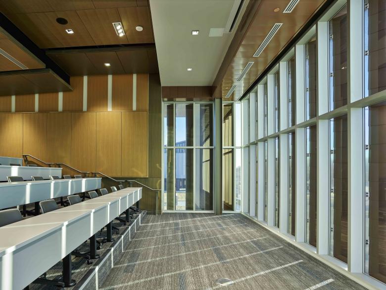 The City of Springdale has limited and finite resources for building and maintenance of the project. The programming planned for and included space for 20 years of growth in the project. The design solution had to be economical and exhibit both long-term flexibility for office areas and durability for public use areas. The exterior combined brick and precast concrete skin. The precast panels are shaped to be an active light and shallow changing surface. The goal is to utilize an inexpensive material and achieve civic presence with a dynamic pattern of light and warm and cool shadows. Interior materials include ground-face concrete block walls, polished concrete floors, and exposed painted steel. The three civic rooms; the council chamber, the courtroom, and the police training room are each upgraded with natural light, a view of the park and city, and adorned with acoustic wood paneling and oak-trimmed steel trusses.