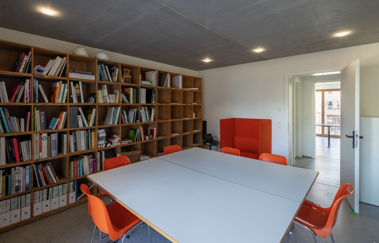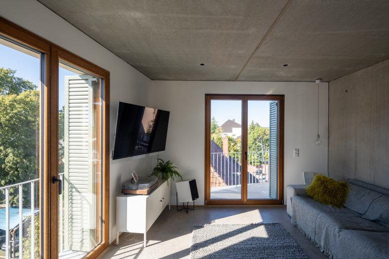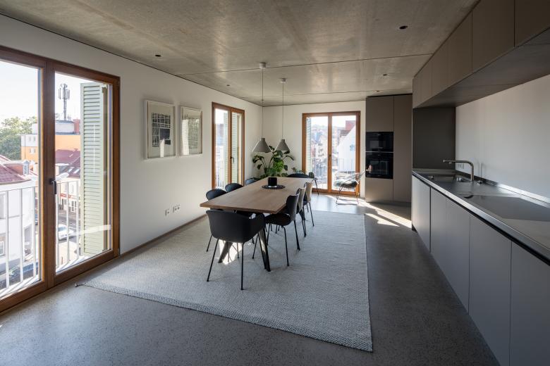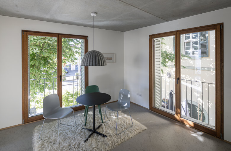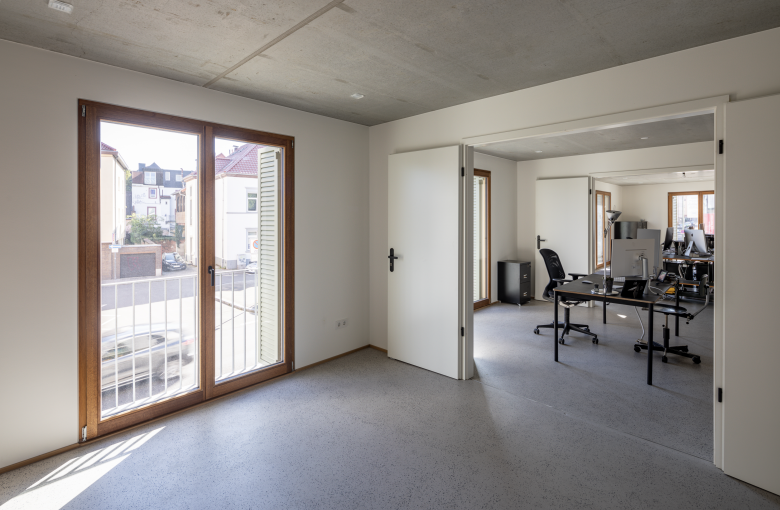 Im Erdgeschoss sind Büroräume untergebracht; darüber entstehen drei großzügige Wohneinheiten, deren Grundrisse bewusst flexibel angelegt sind. Sie ermöglichen eine spätere Anpassung zwischen Wohn- und Gewerbenutzung – ein Beitrag zur langfristigen Resilienz innerstädtischer Strukturen. Konstruktiv setzt das Gebäude auf einen monolithischen Massivbau mit Stahlbetondecken und Betonkernaktivierung. In Kombination mit einer Luftwärmepumpe und Fernwärme entsteht ein energieeffizientes, robustes System. Flachdachbegrünung und ein kleines Zink-Stehfalzdach ergänzen das bauliche Ensemble.