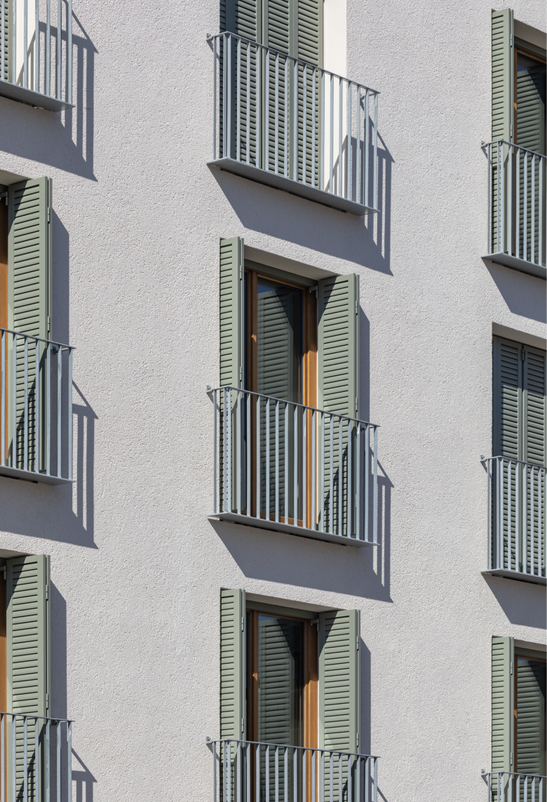 Die ruhige Gliederung der straßenseitigen Fassade orientiert sich an klassischen Kompositionsprinzipien. Holzfenster, Dreifachverglasung und faltschiebbare Klappläden setzen handwerklich geprägte Akzente und vermitteln einen warmen Ausdruck inmitten des steinernen Bestands. Französische Balkone und präzise gesetzte Öffnungen rhythmisieren die Fassadenflächen, ohne die Klarheit des Gesamtbildes zu stören.