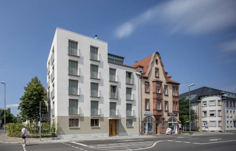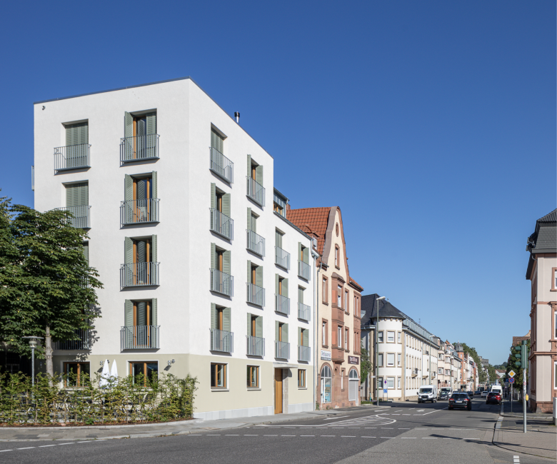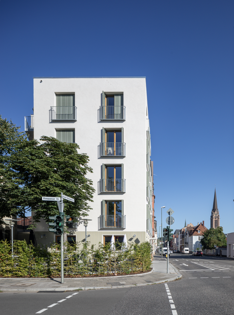 An einer städtebaulich exponierten Ecke der Kaiserslauterer Innenstadt gelingt es dem Neubau, eine lange bestehende Lücke im gründerzeitlichen Gefüge präzise zu schließen. Das Projekt reagiert auf die historischen Achsen der Bindewald’schen Planung und nimmt die Maßstäblichkeit der umgebenden Bauten selbstverständlich auf. Die neue Eckfigur fasst den Straßenraum, ohne das freistehende Nachbargebäude Nr. 58 zu dominieren – dessen Solitärcharakter bleibt bewusst erhalten.