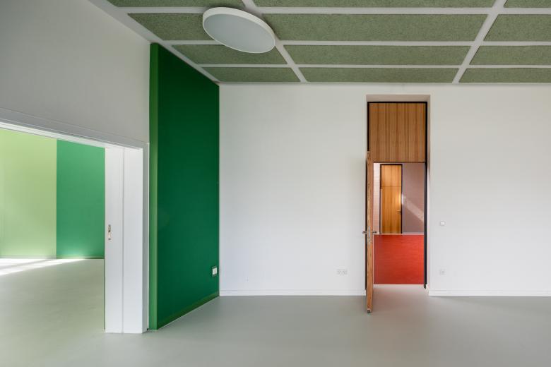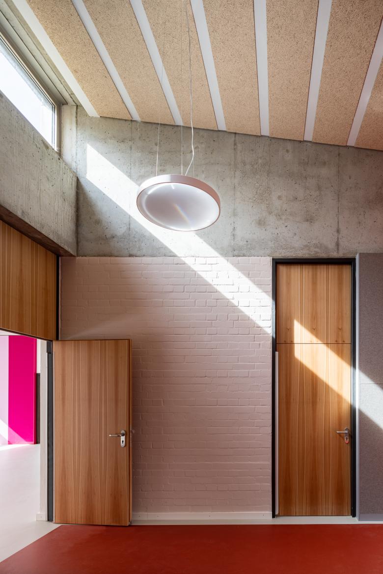 Charakteristisch für die Gebäudekonstruktion sind die Sichtbeton- und Sichtmauerwerksflächen, die Betonrippendecken und die hohen Türelemente. Diese typischen Elemente wurden erhalten oder nachempfunden. Besonderes Augenmerk liegt auf dem Farb- und Materialzusammenspiel sowie den atmosphärischen und strukturellen Qualitäten des Bestands. Von zentraler Bedeutung ist das neue Farbkonzept. Jeder Gruppe wird eine Farbfamilie zugeordnet, die an Decken und Wänden raumweise variieren.