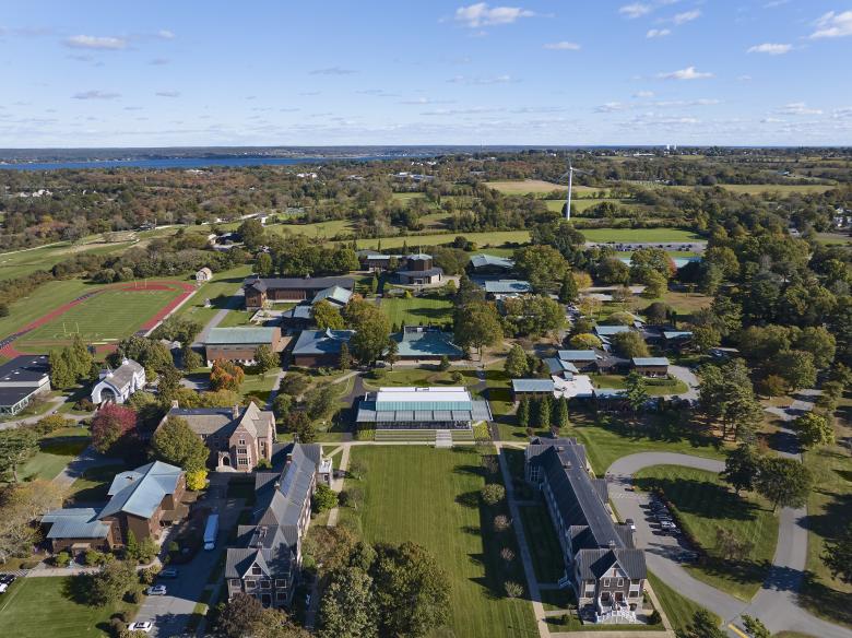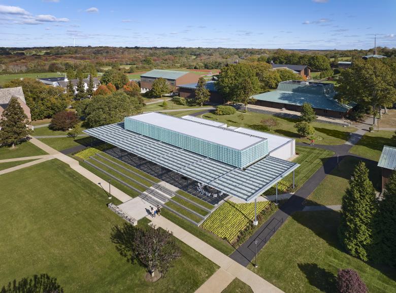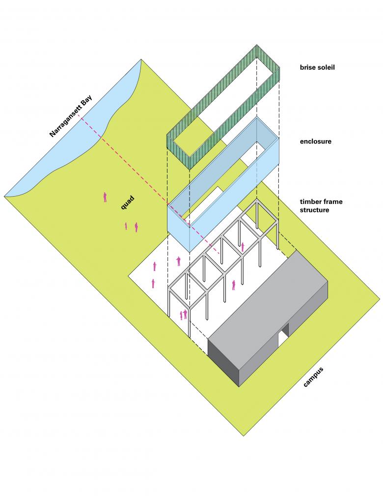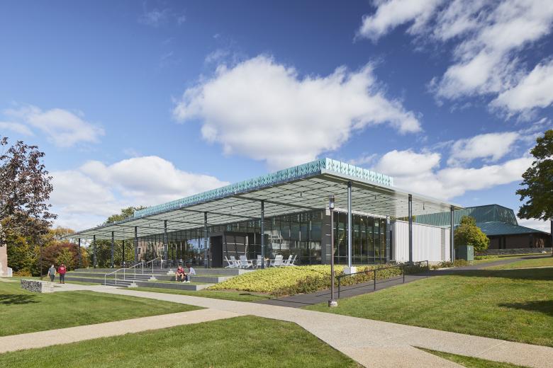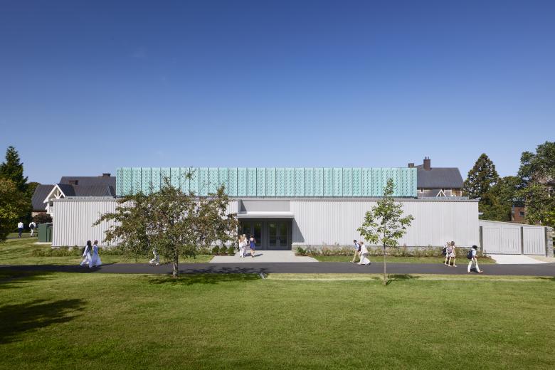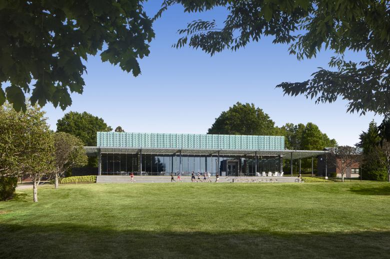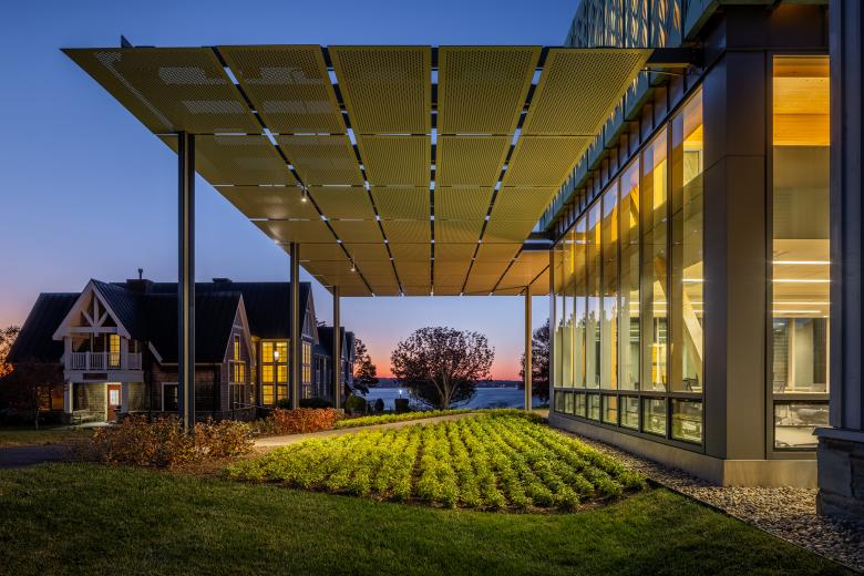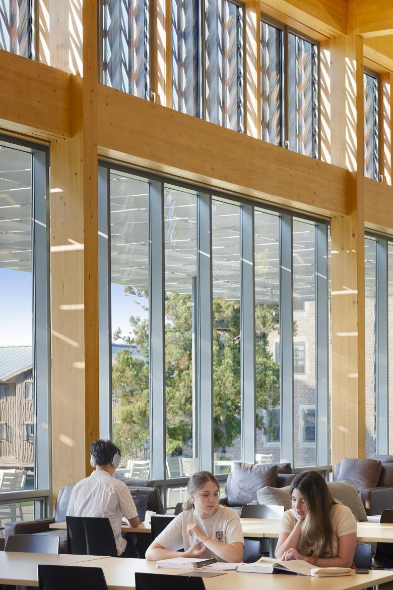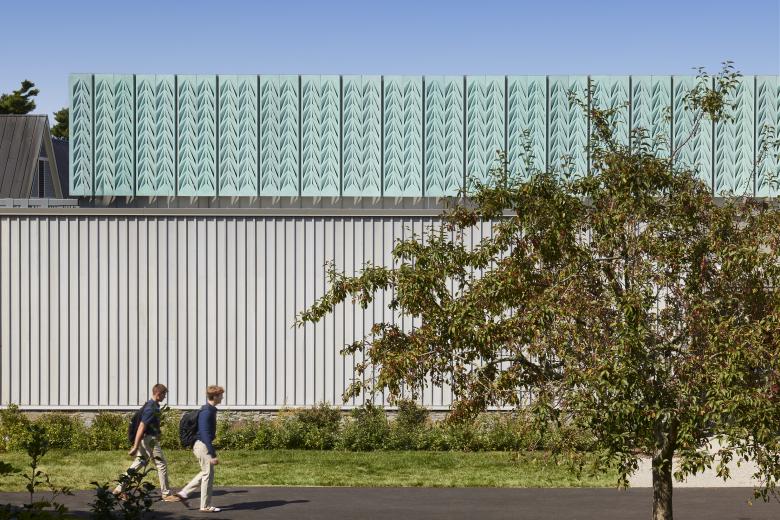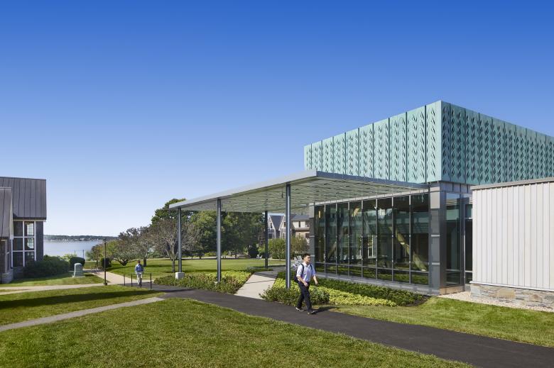 Portsmouth Abbey School’s uniform campus was designed by Pietro Belluschi in 1964. The new student center reinterprets the iconic architectural language of the original campus while providing innovative sustainable solutions to its siting. A timber-framed, glass-enclosed commons re¬calls the exposed wood structures of the historic campus buildings. On top of the commons, a pre-pa¬tinated copper brise soleil controls heat gain and solar glare while referencing the distinctive copper rooftops of the surrounding structures. The decorative perforation of this screen was inspired by the wings of St. Benedict’s raven - an inspirational narrative of this Benedictine community. Extending beyond the commons is an outdoor-covered terrace and amphitheater that faces the Bay. A perforat¬ed aluminum pergola covers the terrace allowing diffused sunlight inside as it shades and cools the seating beneath it. Recalling the deep overhangs of the adjacent historic build¬ings, the broad reach of the pergola allows the student center to sit comfortably amongst its neighbors.