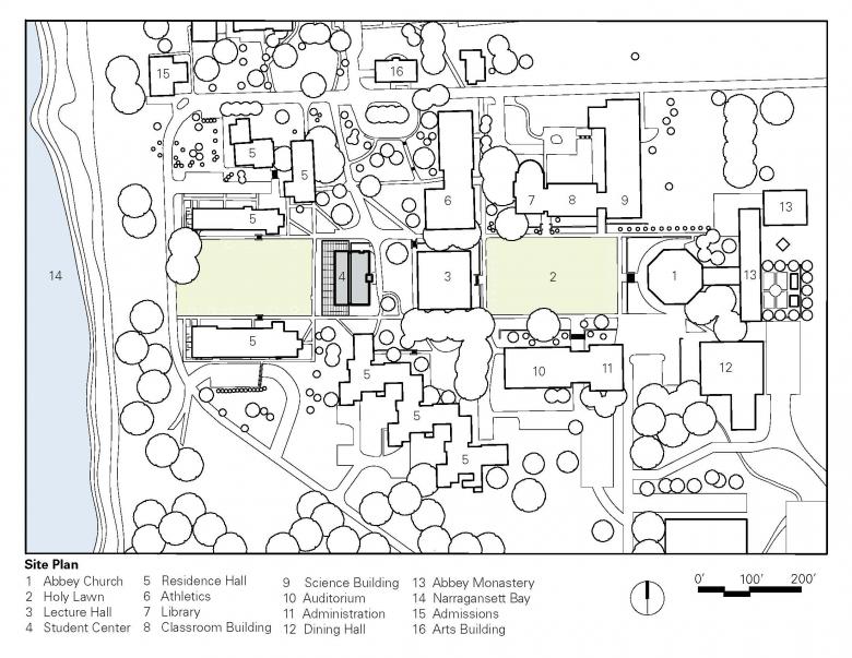 In fulfilling the vision of its campus masterplan, Portsmouth Abbey School, a grade 9 -12 boarding school in Portsmouth, RI, sought to build a student center that would transform life on campus. Overlooking Narragansett Bay, the 8,000-sf center is conceived as ‘a student porch’ to gaze out onto the world.