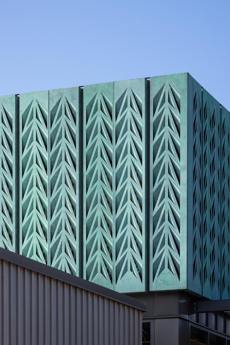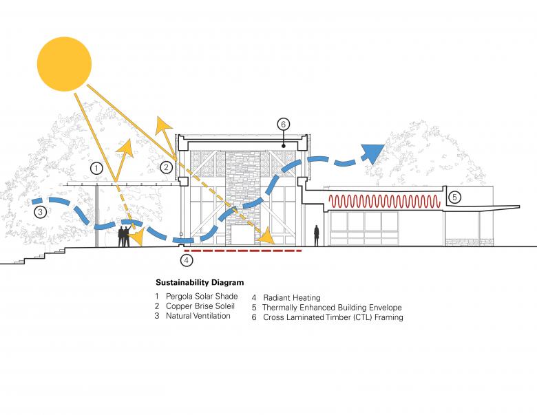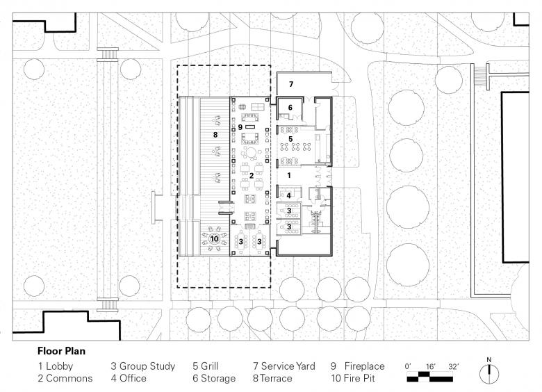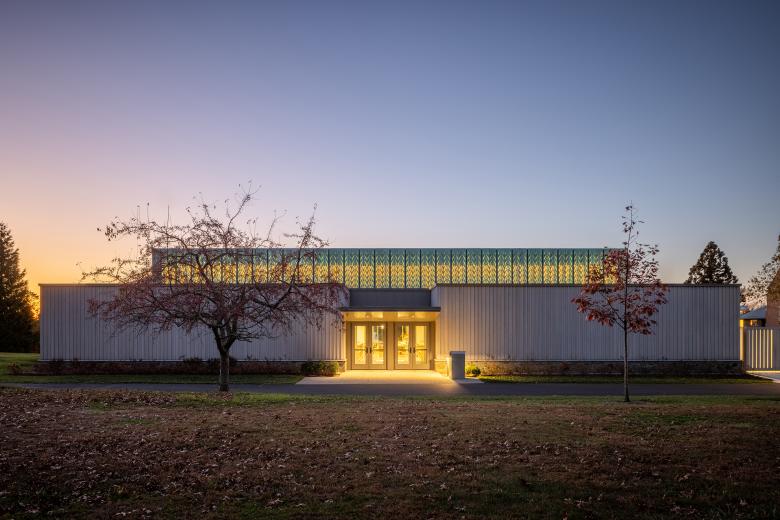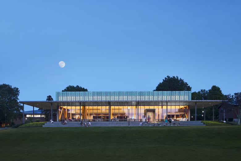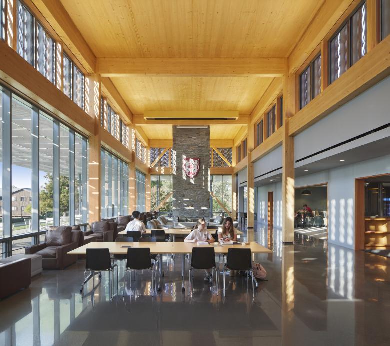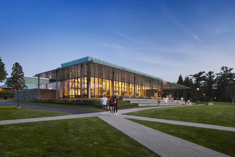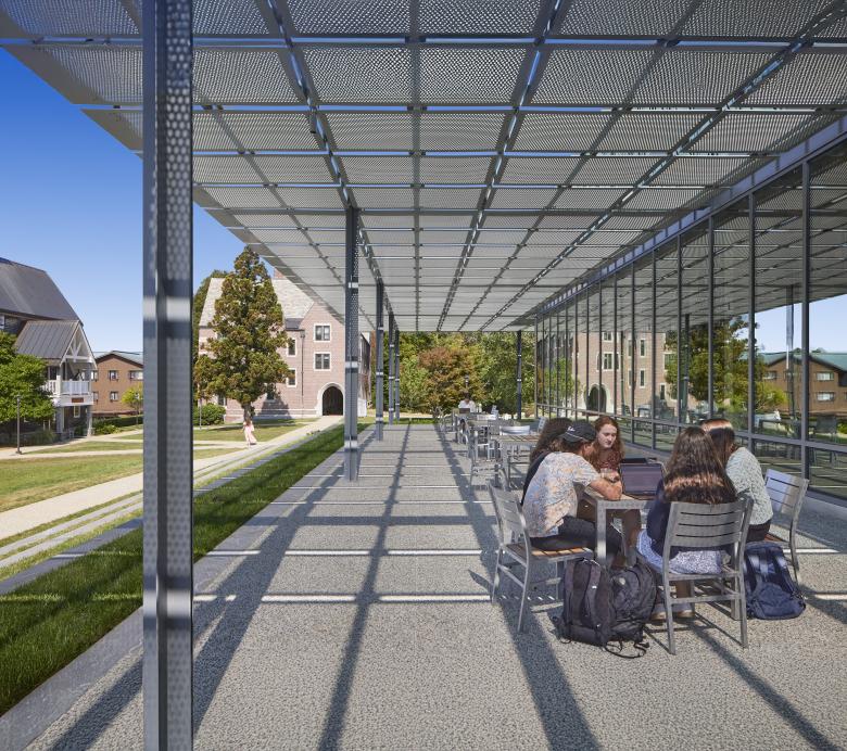 Internally the center houses a flexible, multi-format commons for casual work and study, presentations, meetings, and school dances. Group study rooms provide students with space to work collaboratively, and a grill room offers them access to comfort food. The copper screen and pergola that wraps these spaces creates patterns of dappled sunlight inside resulting in an ephemeral environment of inspiration and delight reminiscent of the sacred space of the campus chapel. The student center has positively impacted this academic community by providing students with an inspirational space for gathering, collaboration, and discovery.