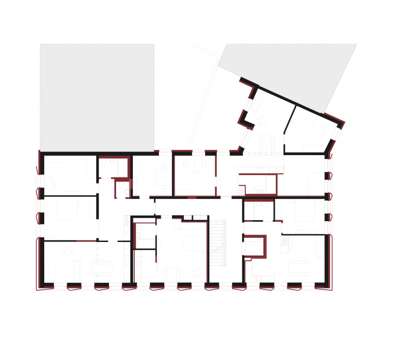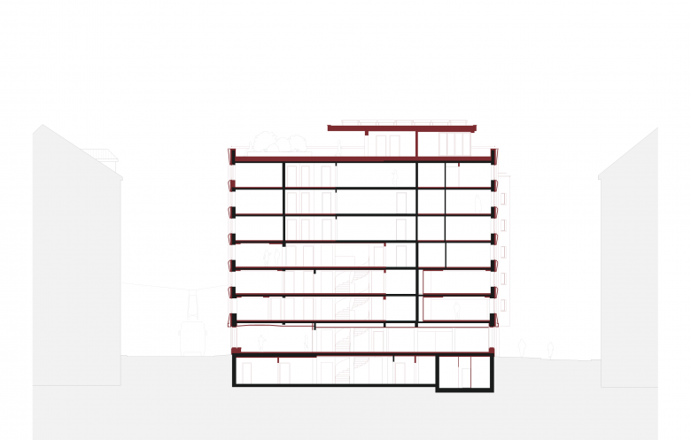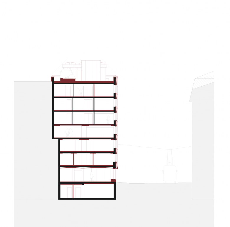 Dem Projektvorschlag liegt das Umbau-Konzept des «massvollen, situativen Eingriffes» zugrunde. Das übergeordnete Ziel ist ein ressourcenschonender Umgang mit der vorhandenen Bausubstanz, welcher mit gezielten Eingriffen eine zukunftsfähige Nutzung ermöglicht. So erfolgt bei der gleichbleibenden Wohnnutzung eine zurückhaltenderer Eingriff, bei der Transformation von Gewerbe- zu Bankspezifischen-Räumen ein intensiverer Eingriff. Die gesamte Tragstruktur bleibt erhalten und wird nur punktuell, wo notwendig erneuert. Die Gebäudehülle wird durch die Addition wartungsarmer, langlebiger Materialien energetisch saniert und in einen weiteren Lebenszyklus überführt.