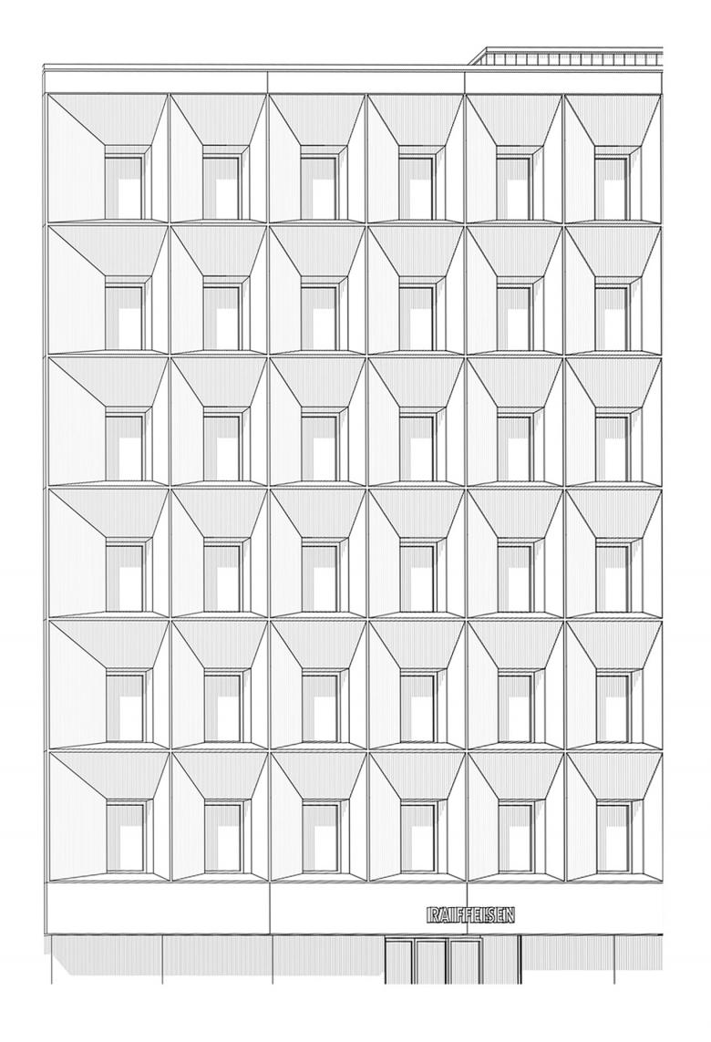 Auf dreieinhalb Geschosse und in einem Teil des Untergeschosses ist der neue Hauptsitz der Raiffeisenbank situiert. Ab dem 3. Obergeschoss sind 13 Wohnungen auf vier Geschossen angeordnet, die mit minimalen strukturellen Eingriffen den heutigen Wohnbedürfnissen angepasst werden und dadurch an Wohnqualität gewinnen. Da die Bewohner keine privaten Aussenräume besitzen, wird eine gemeinschaftliche Dachterrasse über dem Attikageschoss zur Verfügung gestellt. Das bestehende Bauvolumen des Attikageschosses wird auf Grund seines schlechten Zustandes durch einen Ersatzneubau ersetzt.