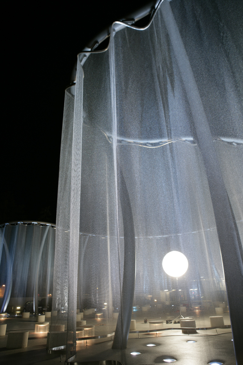 This sophisticated and fantastic veil has been completed in 2008 for the Swarovski works in Wattens, Austria. The Veil transforms the Swarovskistraße in a bright boulevard of constant magical change. The new pathway marked by the billowing veiled curtain becomes a new place of poetic play; of light and shade; of an iridescent dalliance of colors and of amazingly magical moments of expression and transformation. During the day, rays of sun and passing clouds toy with the new space, creating a continual metamorphosis. Depending on how the sunlight meets the curtain and on the visual angle, the curtain emerges either as a dazzling, sparkling veil or vanishes completely from the eye. The incessant transformation of the curtain at daytime triggered by the sun and the clouds is emulated at nightfall by luminaria. A peaceful start, as if by magic, triggers an interaction of color with the hues of the sky. The intensity of the light adapts to the surrounding brightness; not glaring or vying for effects, but of a harmonizing and soothing quality. The lighting dims. We gently draw the curtain. The silent movie starts and follows a virtual script composed of an overture, calming shades, quick and quiet rhythms. The veiled curtain forms the groundwork of the installation. The soft change of color and lighting makes the curtain radiate like a crystal, with an opulence of hues ranging from mythical blue to a clear, bright white. Like all other design elements, the light conveys an activating seeing. Like creatures of the light and natural phenomena, the statures rejoice in merry games. The veil is made of a corrosion- and weather-resistant stainless steel mesh. It gives rise to a varied play of light and embodies a never-before seen materialness, held in place by a 10-meter high steel stringer. A group of illuminated pads creates a seating arrangement and doubles as the boundary to what lies beyond… During the day, rays of sun and traveling clouds revel in this space, triggering a constant change. When night falls, a spectacle takes place that lives in harmony with the hues of the sky. This setting forms the groundwork for a permanent and enchanting transformation.