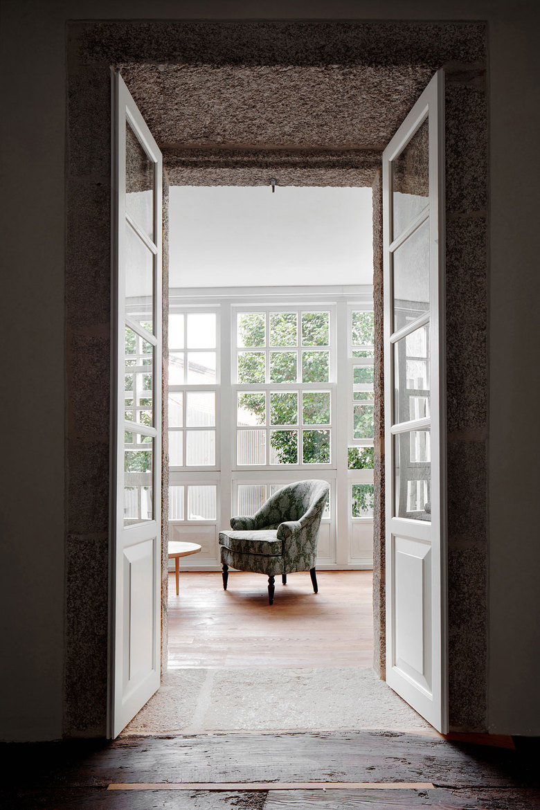 As occurs in much of the historic city center of Santiago, the house has a facade at the back which opens onto a garden with two enormous camellias. A carefully executed paved area of granite redefines the point of contact of the rear gallery on the ground floor (now converted into a common room for guests) with the garden.