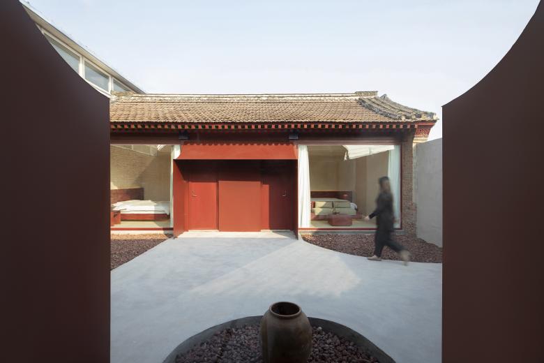 The project is located in Tangdazhuang Village in Tongzhou District, Beijing is a village that preserves the traditional northern flat house architectural style. The houses here are made of red bricks and have elements of ancient Chinese architecture such as painted patterns, wooden structure sloping roofs, and other traditional features. Extracting and reconstructing these traditional architectural features is a challenging design task. Atelier d’More was commissioned to transform a small flat house and courtyard, with a total area of only over 80 square meters, into a boutique hotel, injecting new modern geometric elements into the original architectural and site characteristics, reshaping the architectural context, and practicing a new imagination of traditional architecture.