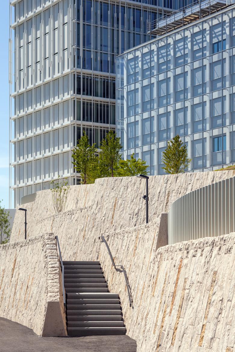 Die Gestaltung orientiert sich an den Strömungsmustern des Flusses, die ihre Fortsetzung in den zur Überbrückung des Höhenunterschiedes notwendigen Mauern finden. Sie nehmen die geschwungenen Bewegungen auf und führen sie in den Wegbereichen weiter. Wie selbstverständlich verweben sich die integrierten Treppen und Rampen mit den Mauern und stellen die Verbindungen zwischen den einzelnen Höhenlevels her. Vertikal angeordnete, gebrochene Kalksteinbänder verleihen dem Uferabschnitt einen warmen, textilen Ausdruck.
