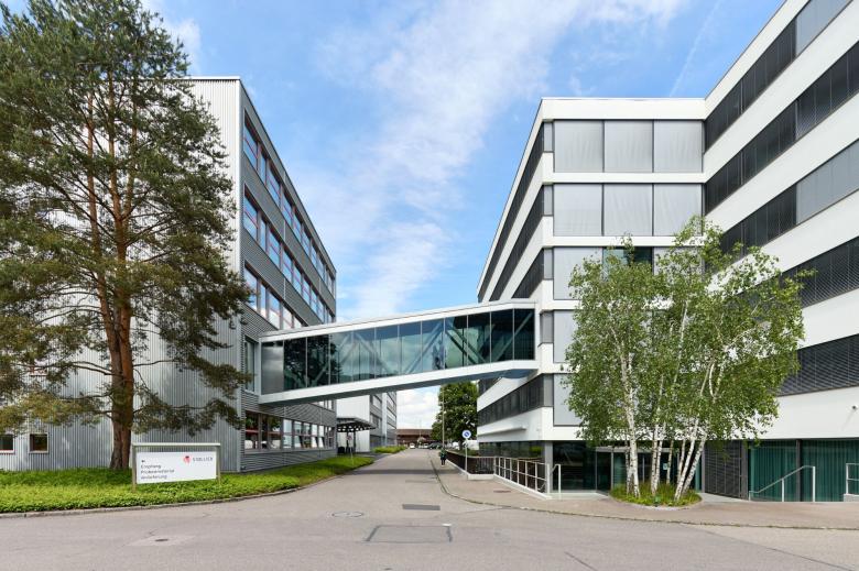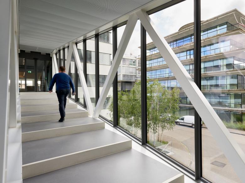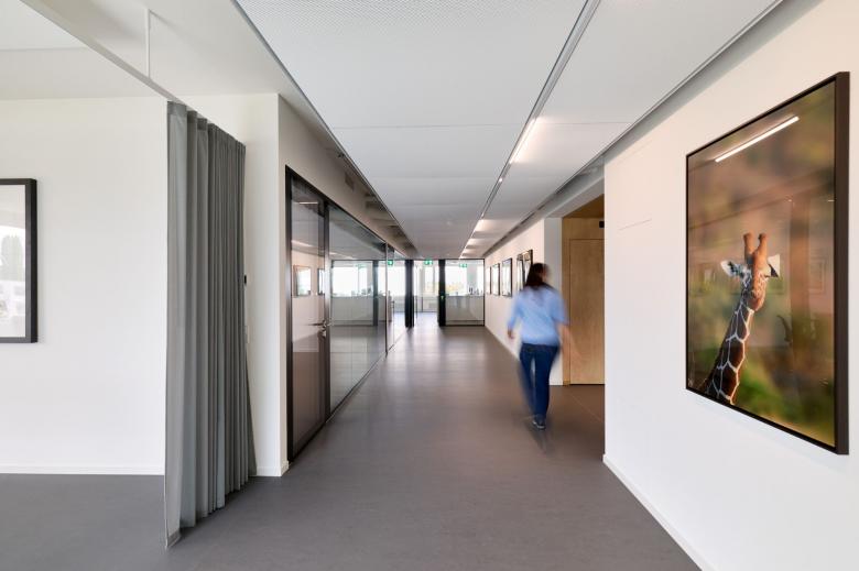 Eine 16 Meter lange neugebaute Passerelle verbindet neu Alt- und Neubau. Sie verkürzt Wege, stärkt die Vernetzung und fügt sich dank Spezialverglasung und weissem Stahl harmonisch in die Architektur ein – funktional, leicht und unaufdringlich.
