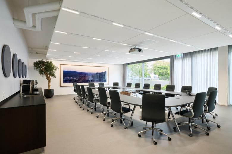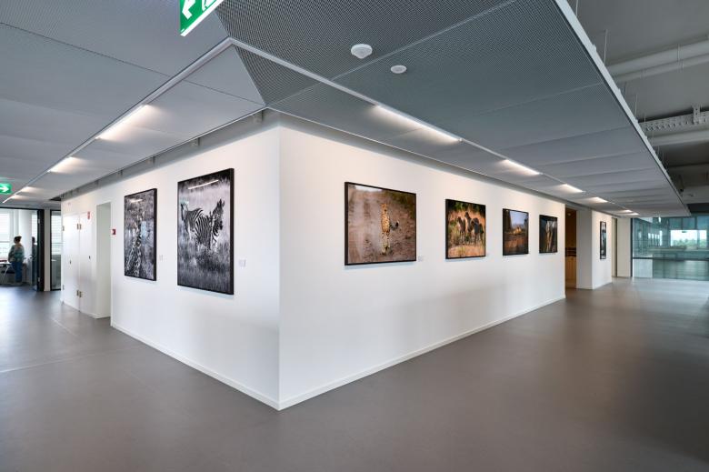 Das Erdgeschoss bietet nun Seminarräume sowie eine grosszügige Cafeteria mit Aussensitzplätzen. Ein Highlight: die inszenierte Kunstsammlung ders Auftraggebers – beleuchtet durch Wallwasher und sichtbar von den Arbeitsplätzen aus.
