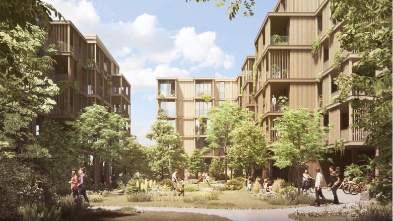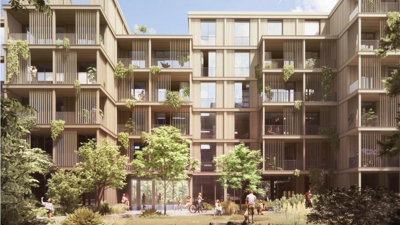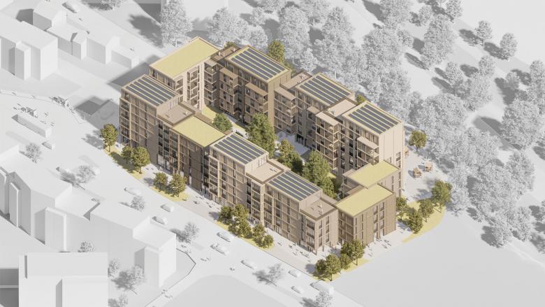 The design consists of differentiated building blocks that harmonize with the suburban context through thoughtful height variations and strategic positioning. A taller block near the town center establishes a strong address and landmark, while lower volumes at the entrance create a welcoming transition. The courtyard layout serves as the heart of the project, offering sunlight and high-quality living environment, with all residential units oriented towards it for optimal light, views, and privacy. To address noise from the highway, a carefully positioned block acts as a buffer while maintaining visual and spatial openness. This arrangement ensures a balance between functionality and livability, offering distinct addresses, a coherent urban presence, and a vibrant courtyard space for community life. The result is a development that seamlessly integrates with its surroundings while enhancing residential quality.