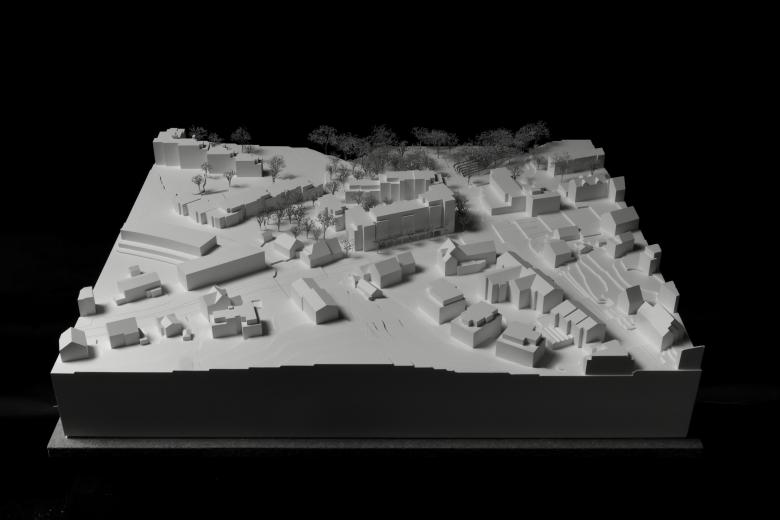 Der neue Zentrumsbau bezieht sich als strassenbegleitendes Volumen in seiner Massstäblichkeit auf die altrechtlichen Arealüberbauungen in zweiter Reihe. So besteht der Anspruch, einen neuen Ort zu schaffen, welcher dem Zentrum Unterdorf in Witikon eine neue Identität verleiht. Das in der Höhe gestaffelte Gebäude wird entlang der Witikonerstrasse über erkerartige Vorsprünge, Eckrisalite und vorgelagerte, erdgeschossige Teile als vermittelnde Elemente zur Nachbarschaft gegliedert. Der Duktus der bestehenden Bauten mit den Staffelungen wird im Neubau fortgeführt und eigenständig weiterentwickelt. Durch die strassenbegleitende Bebauung wird im Innern ein parkartiger Innenhof mit den bestehenden Bauten räumlich gefasst. Jeweils in Ost-West-Richtung und entsprechend der Kaltluftströmung ist das neue Ensemble offen und mit der Umgebung vernetzt. Über zwei offene Durchgänge wird der Strassenraum mit dem parkartigen Innenhof verbunden. Dadurch werden auch die Bestandesbauten in der zweiten Bautiefe auf selbstverständliche Art und Weise erschlossen. Zudem liegen an den Durchgängen angrenzend jeweils die Eingangshallen zu den Treppenhäusern. Eine Arkade artikuliert die Wichtigkeit der öffentlichen Bibliothek und trägt den Gedanken der Zentrumsfunktion nach aussen hin. Entsprechend der Lage werden unterschiedliche Wohnungstypen entwickelt. Im mittigen Gebäudeteil werden durchgesteckte Kleinwohnungen mit einer offenen Raumabfolge von Ess- und Wohnbereich mit vorgelagerter Küche angeordnet. An den Gebäudeflügeln befinden sich Über-Eck angeordnete Wohnungen.