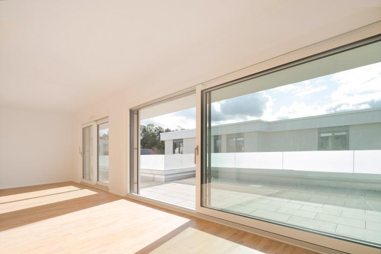 Ein hoher Verglasungsanteil mit raumhohen Fensterelementen und Schiebetüren nach Süden sowie differenzierte Lochfassaden nach Norden, Osten und Westen bilden eine klare Fassadengliederung, die sich sich aus den funktionalen, offenen Grundrissen heraus entwickelt.