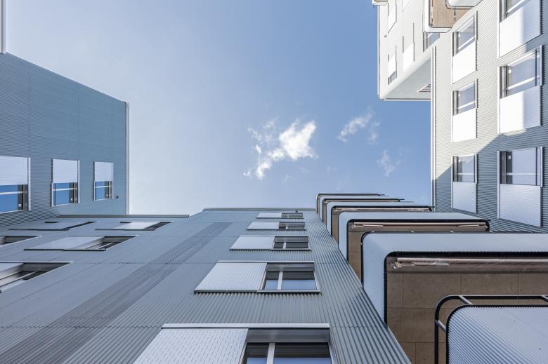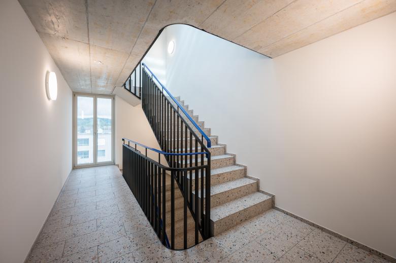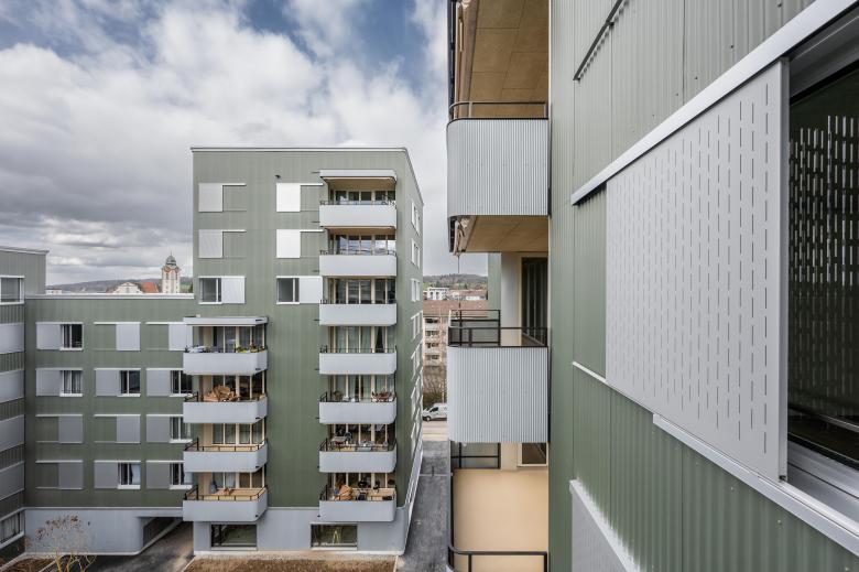 Die zentral gelegene Wohnüberbauung besteht aus drei Baukörpern mit insgesamt 80 Wohnungen. Die Baukörper weisen eine differenzierte Geschossigkeit auf und sind leicht zueinander versetzt. Die Sockelgeschosse, verkleidet mit Glasfaserbetonelementen, nehmen Gewerbenutzungen auf. Mit leichten Variationen wiederholen sich die Grundrisse von Geschoss zu Geschoss. Die abgerundeten Gebäudeecken verkleidet mit Wellprofilblech aus vorbewitterten Zinklegierung verleihen den Baukörpern Eleganz. Wegen der hohen Dichte wird der knappe Aussenraum im EG durch begehbare Dachflächen erweitert.