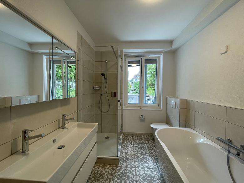 Durch den Mieterwechsel wurde die Wohnung umfassend saniert. Dabei wurde die ehemals geschlossene Küche zum Wohnraum hin geöffnet, wodurch ein offeneres Raumgefühl entstand. Das Badezimmer erhielt eine Aufwertung durch die Integration eines Waschturms, während der zuvor im Bad platzierte Boiler nun in der Küche untergebracht ist. Die Kombination aus gemusterten Bodenfliesen in Küche und Bad sowie den charakteristischen Altbauelementen verleiht der Wohnung ihren charmanten Altbaucharakter.
