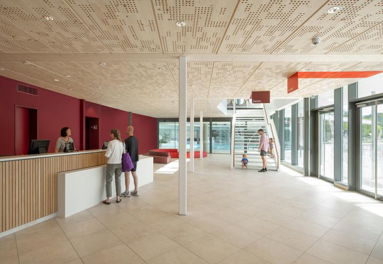 The design concept draws inspiration from the unique surroundings, incorporating the topographically shaped open spaces of the outdoor pools and the existing Wunnebad to formulate a central idea that harmoniously connects the old and the new. At the heart of the new facility stands the striking domed structure of the original bathing hall. This is complemented by a composition of curved roofs and organic forms, which ef-fortlessly integrate the various functional areas. The form of the reworked building re-sponds to its context with sensitivity, blending seamlessly into the environment.