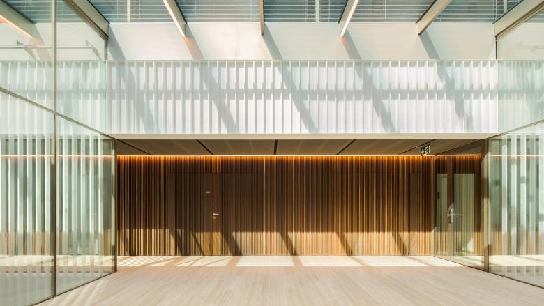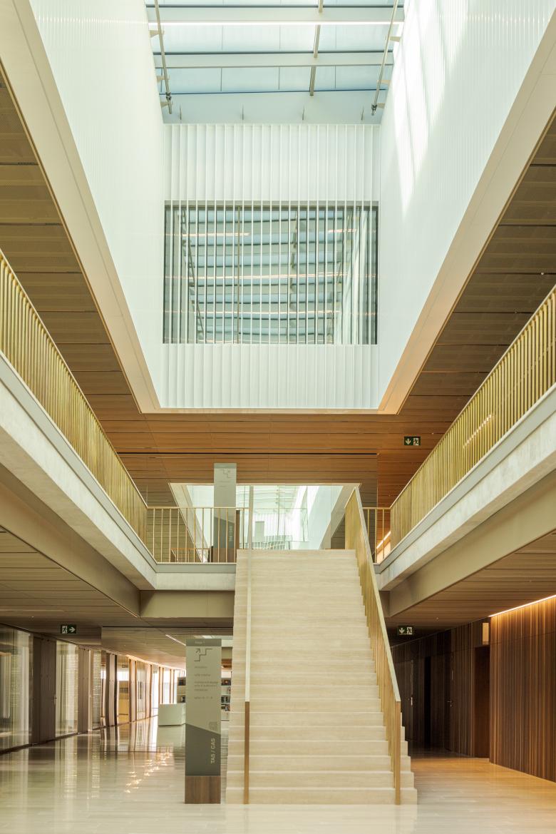 La bande centrale accueille un atrium surmonté d’une verrière conduisant la lumière naturelle jusqu’au coeur du bâtiment. Cet espace central intégrateur relie et distribue les trois niveaux. Il accueille des escaliers ainsi que des salles de réunion, et au 1er étage la bibliothèque et son espace de consultation.