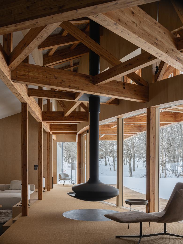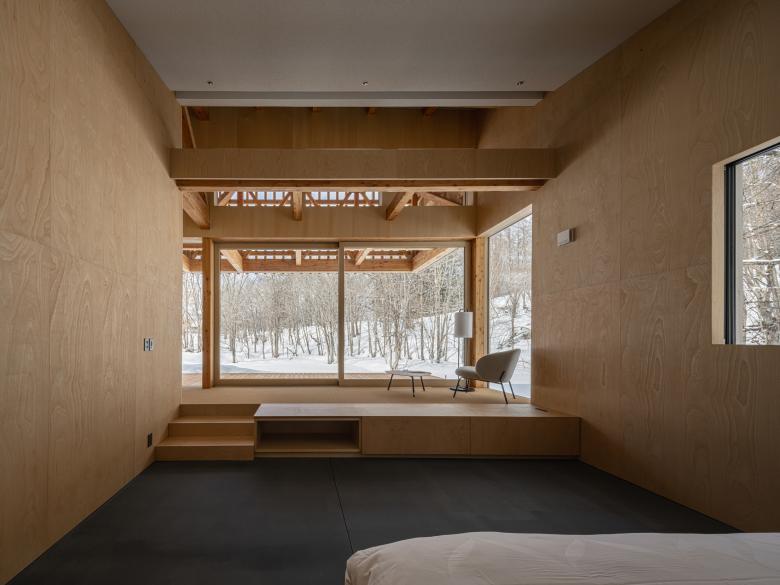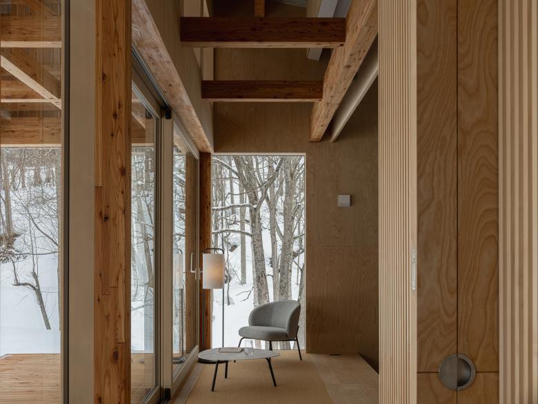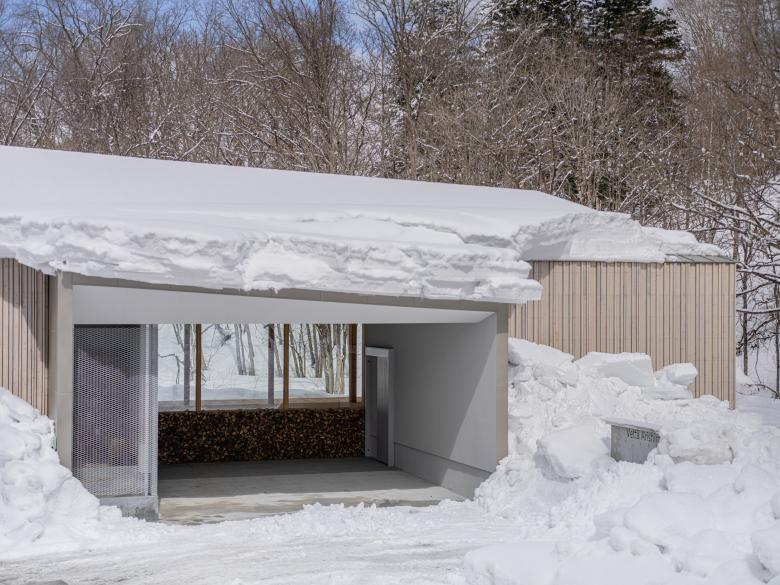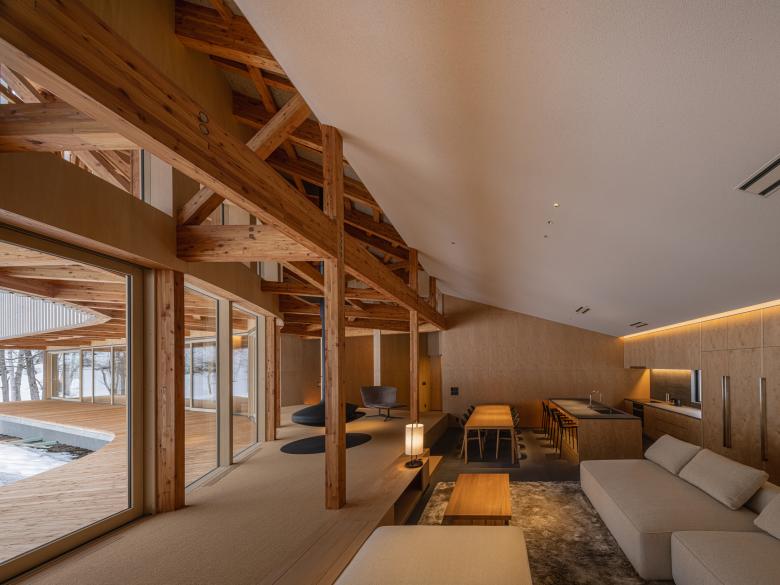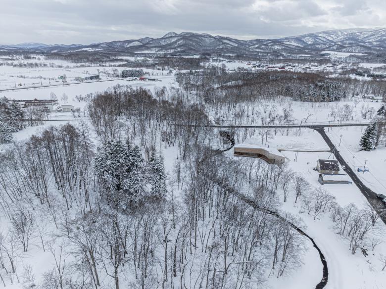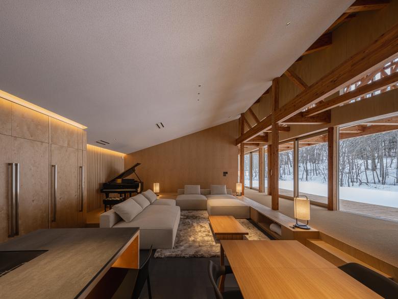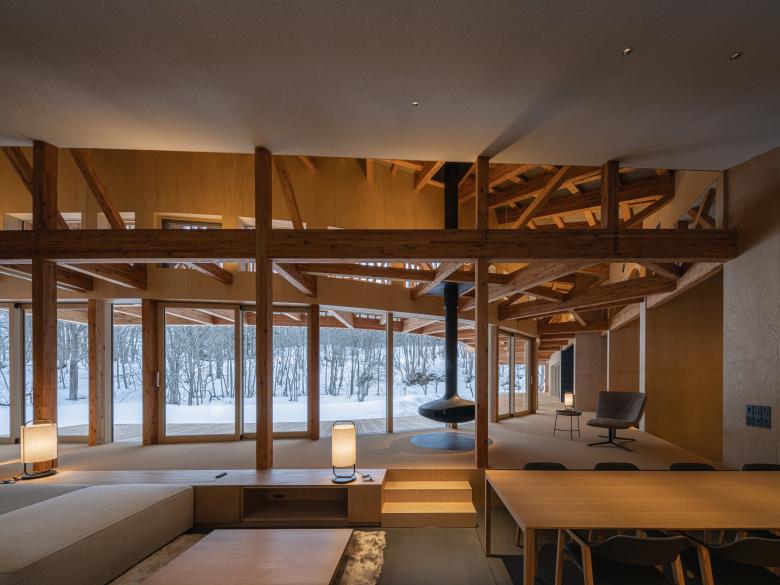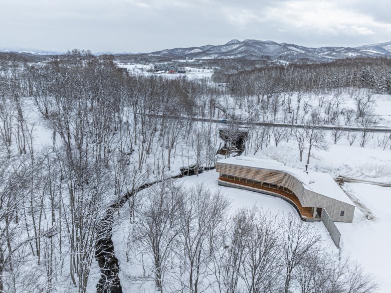 This holiday home for a professional in Niseko, faces a stream leading to the Shiribetsu River, with a forest hill beyond. The one-storey building s curved form mimics the stream's fluid lines, with the shorter side facing the stream, traced by an engawa. This verandad with full-height, operable sliding windows connects internal and external spaces.
