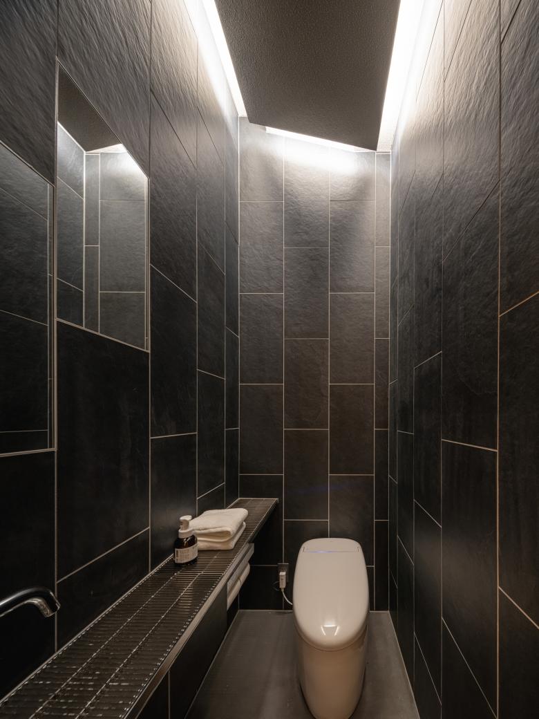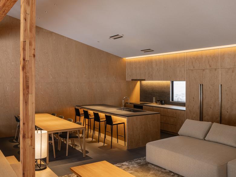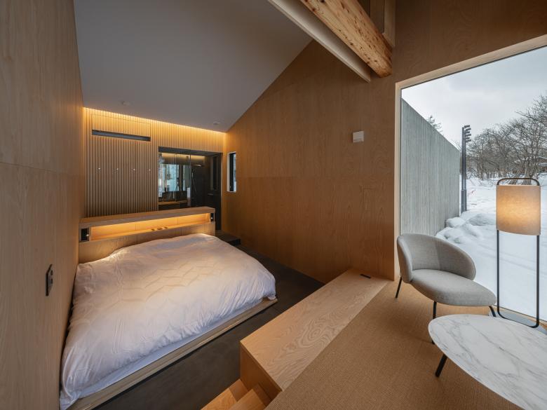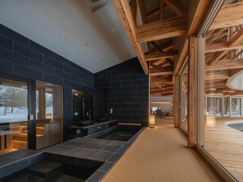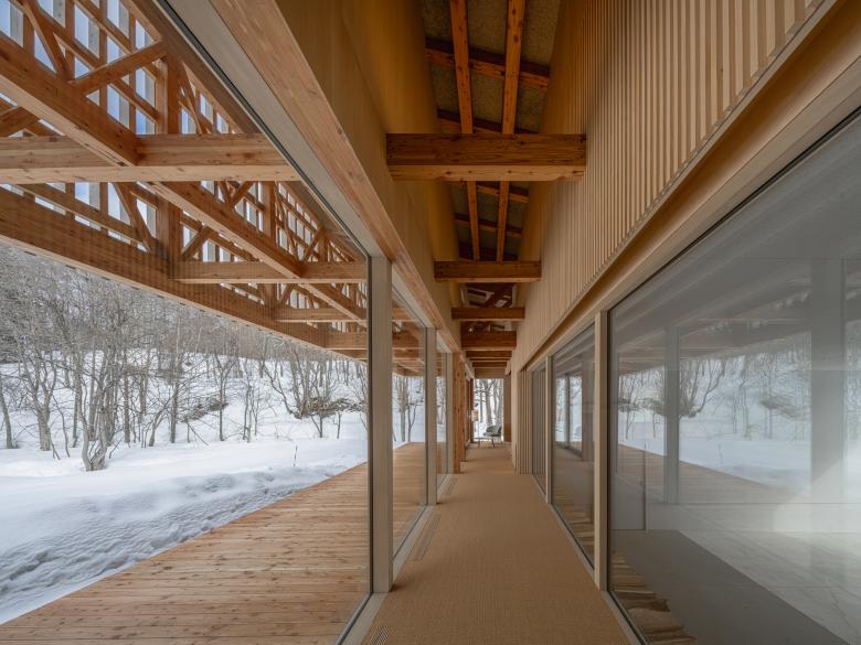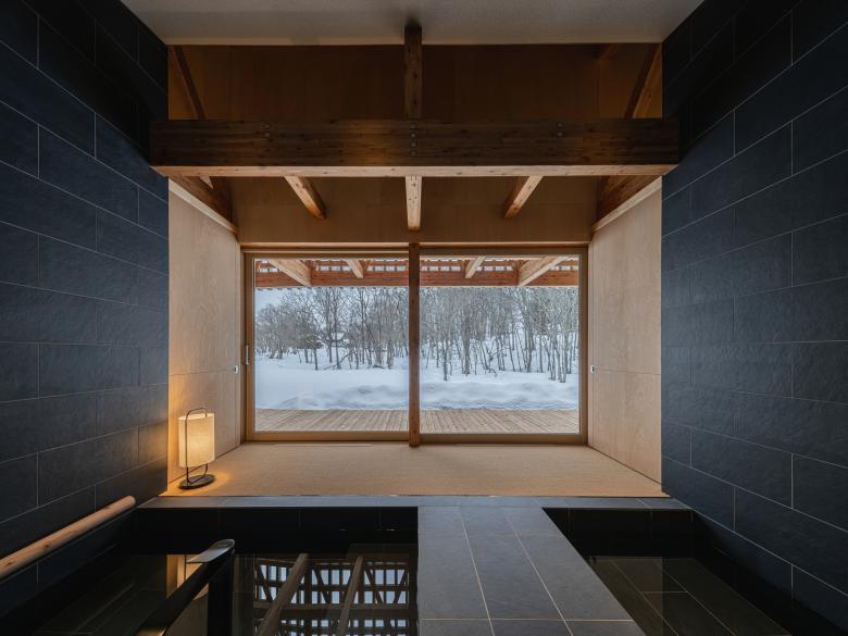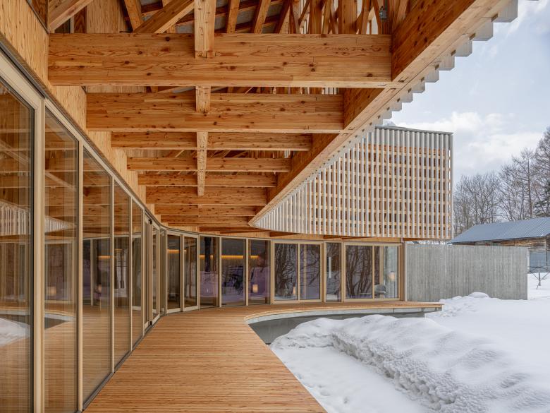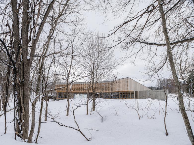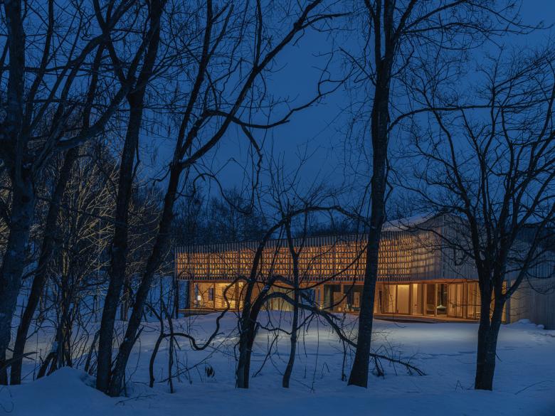 This holiday home for a professional in Niseko, faces a stream leading to the Shiribetsu River, with a forest hill beyond. The one-storey building s curved form mimics the stream's fluid lines, with the shorter side facing the stream, traced by an engawa. This verandad with full-height, operable sliding windows connects internal and external spaces.