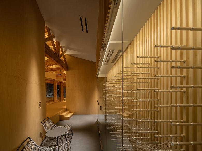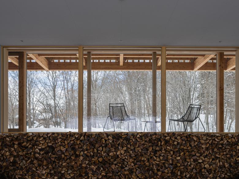 The house's section is less homogeneous; the rooms are tucked lower than the engawa for a grounded perspective, the raised engawa prevents snow from flowing into the space. A large cantilevered roof over the engawa provides shelter and comfort, enabling all season usage. Finally, locally sourced, natural materials bring both tranquilly and connection to the site.