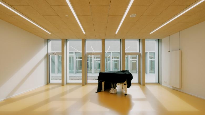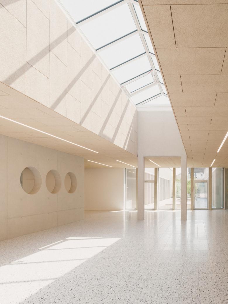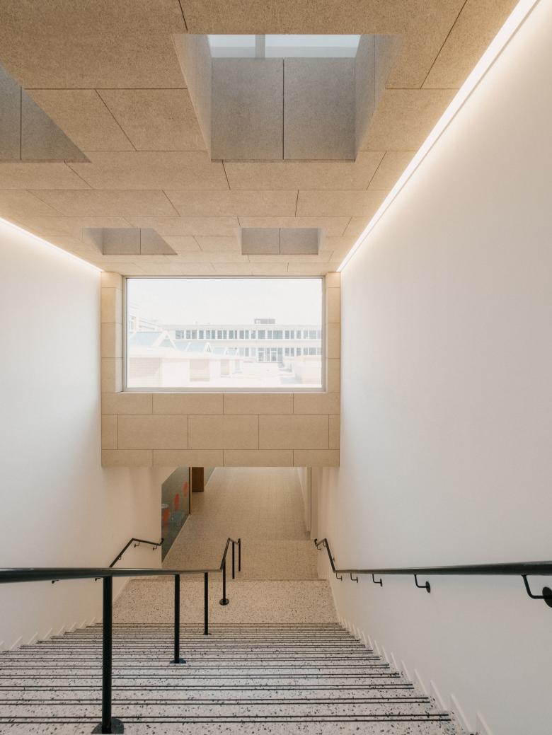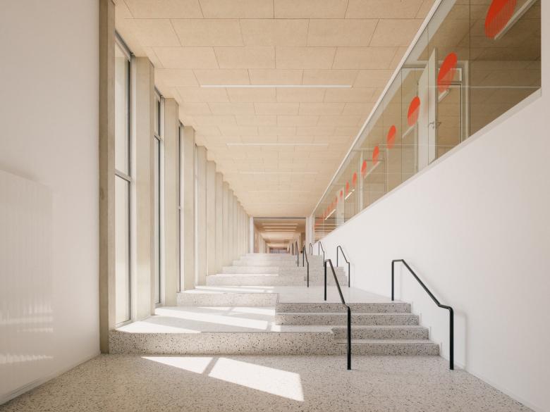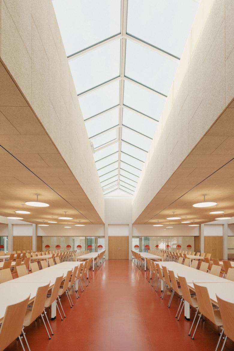 The core of the new ensemble is the central axis with its subtle connections to the outdoors. It links the Realschule with the Gymnasium and provides access to shared functions like the cafeteria, library, and self-study center. It also leads to flexibly adaptable classrooms. Bright, spacious, and marked by the broad stairs, this passageway is designed not just as a circulation route but also as a lounge and a place of encounters.