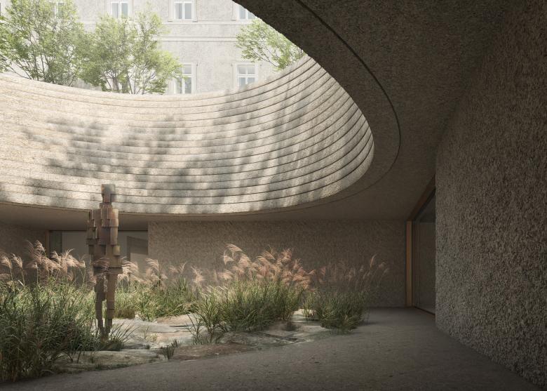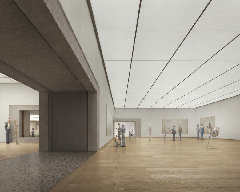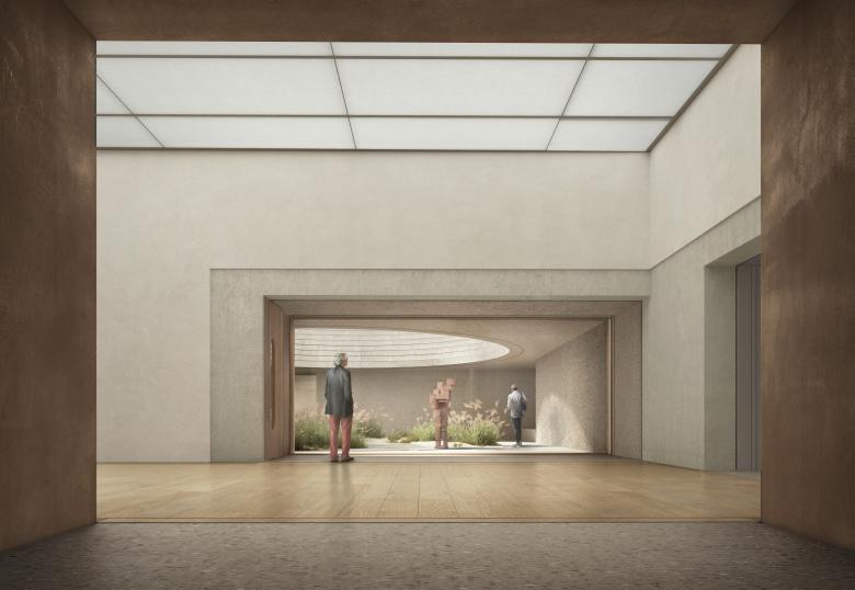 As the defining feature of the inner courtyard, the light well evolves into an overscaled skylight conically staggered towards the exhibition level, creating a concise architectural urban space. On the exhibition level the art should take centre stage, concrete and the luminous ceiling form the functional backdrop. Trees with tall slender trunks spread a green canopy over the courtyard, creating a subtle interplay between light and shadow, reminiscent of the treatment of light in historical landscape paintings.