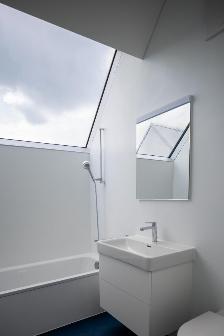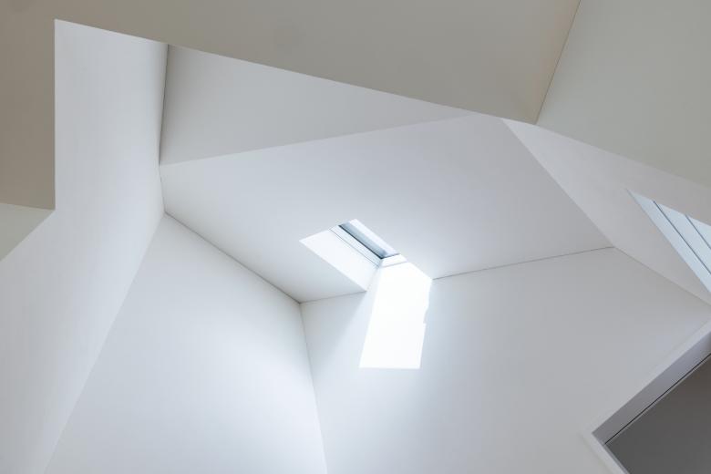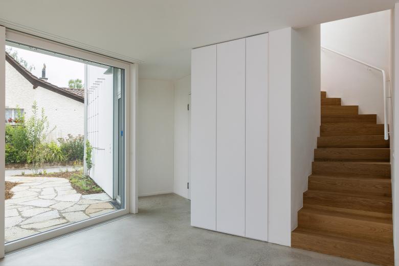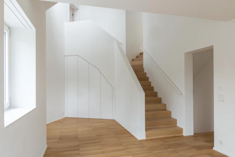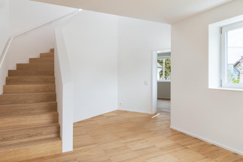 Insgesamt sind fünf grosszügige Wohnungen geplant, vier 4.5-Zimmer-Wohnungen und eine 5.5-Zimmer-Wohnung. Die erdgeschossig angeordnete Gartenküche verbindet sich über grossflächig öffenbare Hebeschiebefenster mit dem Gartenraum. Eine abgewinkelte Treppe verbindet die Küche mit dem darüberliegenden Wohnraum. Dank der Geometrie der Treppenanlage verfügen diese Räume über eine neue Ausrichtung und andere Ausblicke. Jede Wohnung verfügt über einen mehrgeschossigen Raum der bis ins Dach des Hauses greift. So durchzieht eine räumlich vielfältige und dank Überhöhe grosszügige Raumsequenz das gesamte Haus.